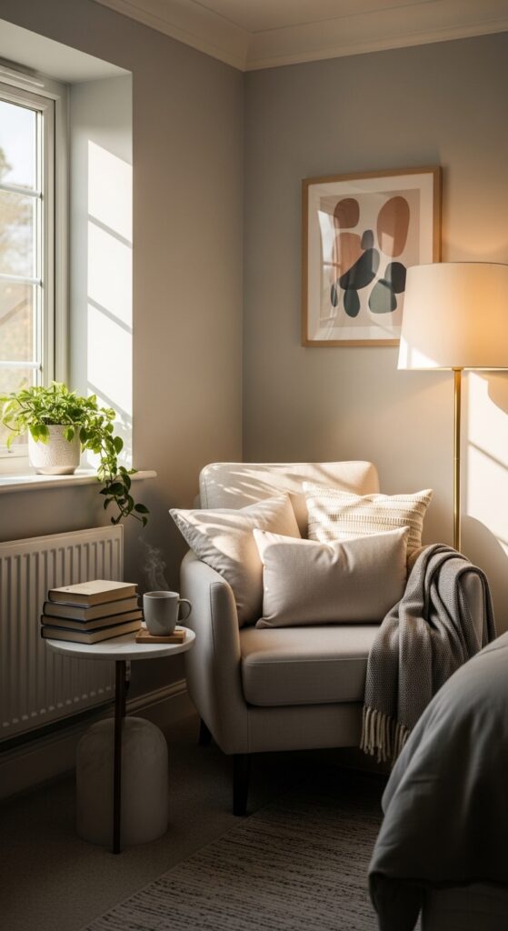 A reading nook can make your bedroom feel more relaxing and personal. A comfortable chair, soft blanket, and small side table are all you need to create this cozy corner.