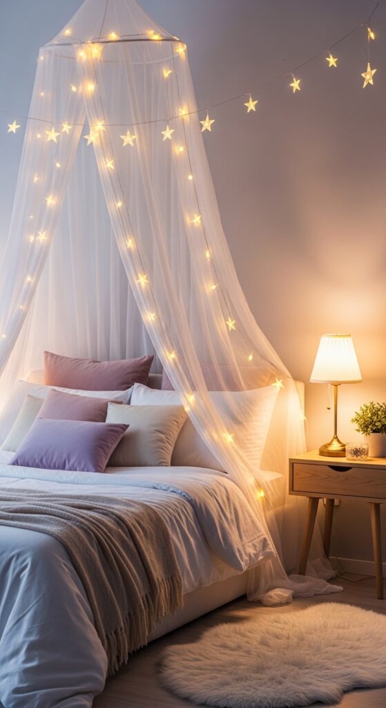 Lighting can dramatically change the mood of a bedroom. Fairy lights or string lights create a warm and cozy atmosphere.