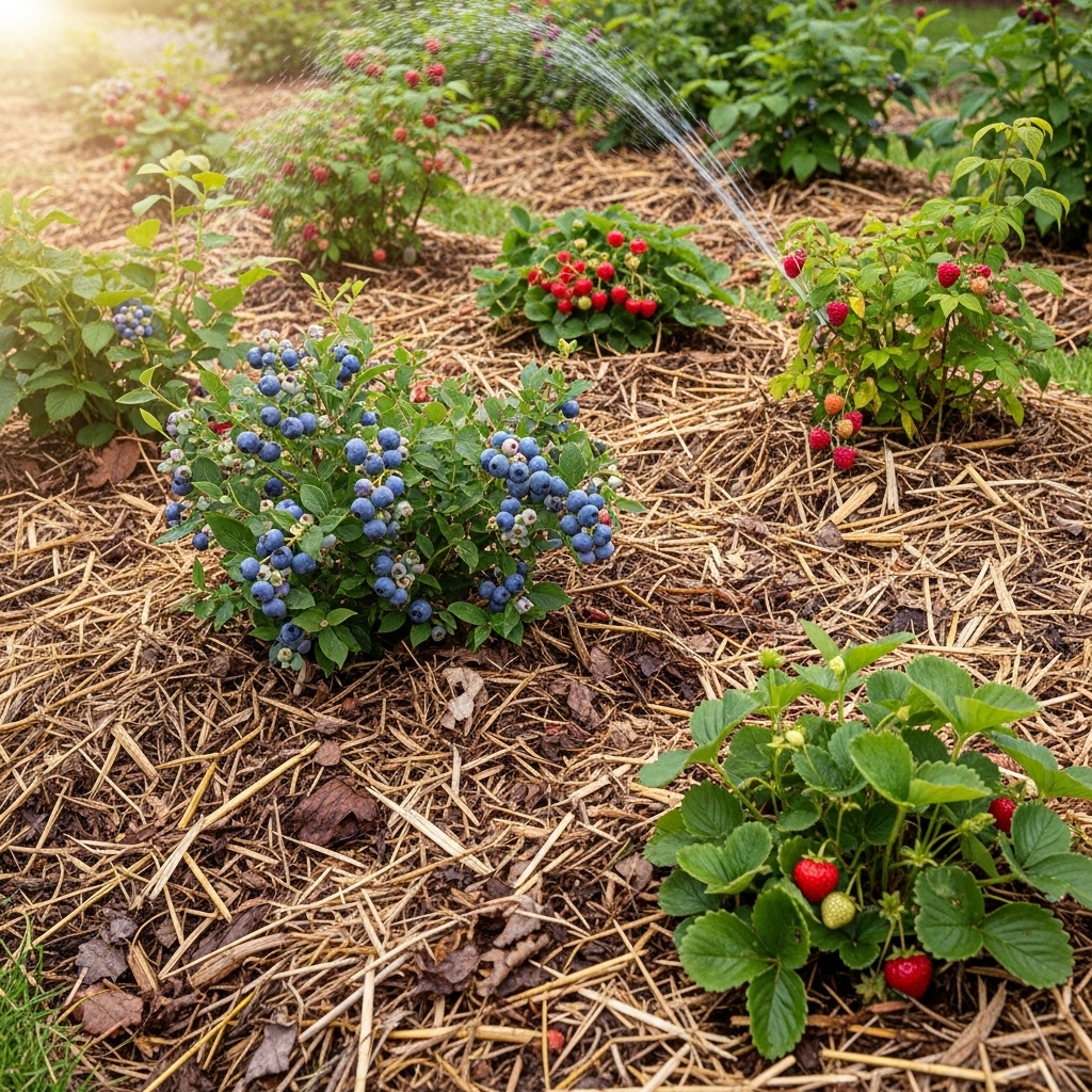Apply mulch around berry plants to retain moisture, regulate temperature, and keep fruit clean. Straw mulch works especially well for strawberries by preventing fruit from touching the soil.
