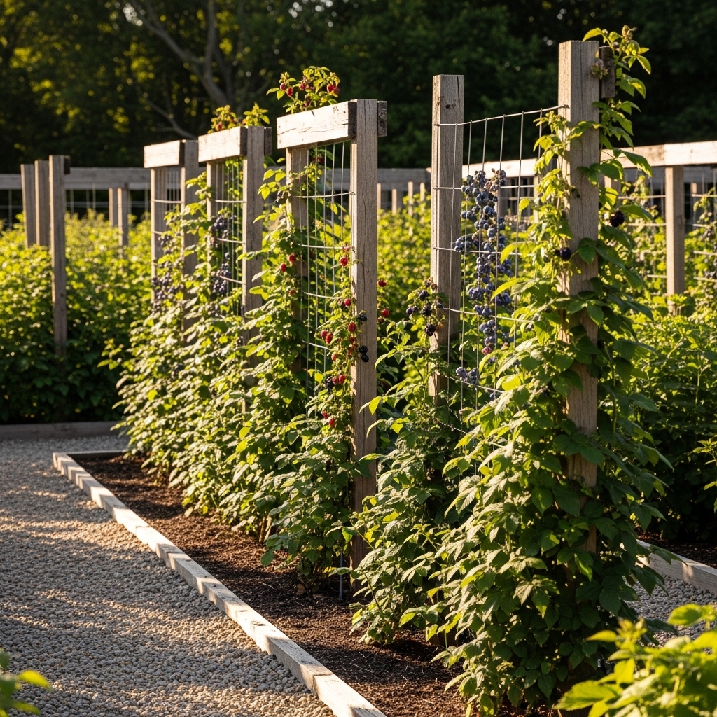 Use trellises or wire systems to guide berry canes upward instead of letting them sprawl on the ground. Tie stems gently as they grow and keep rows organized for easy maintenance and harvesting.