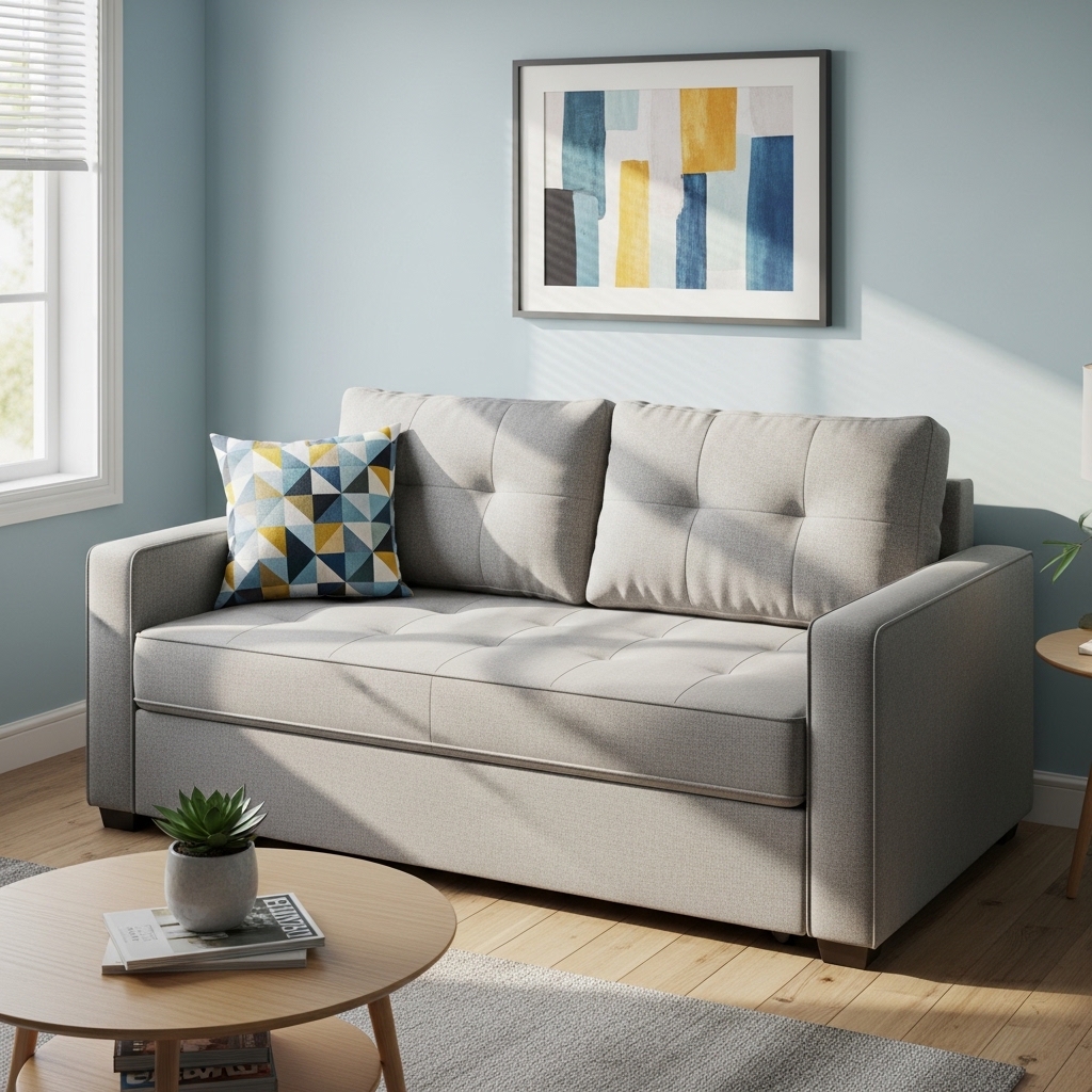 Why it works: A sleeper sofa eliminates the need for a separate guest bed. The room serves two purposes without extra furniture. The apartment size fits in small spaces.