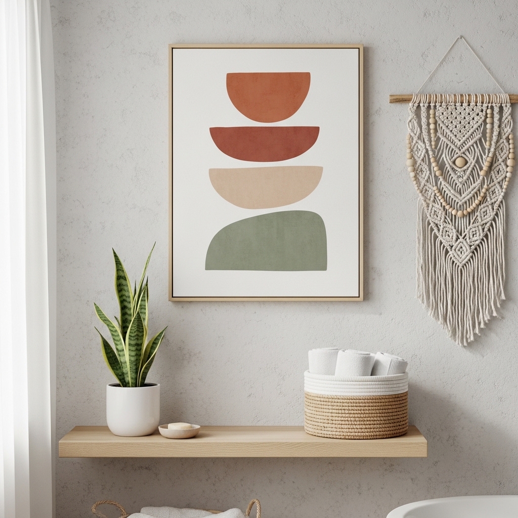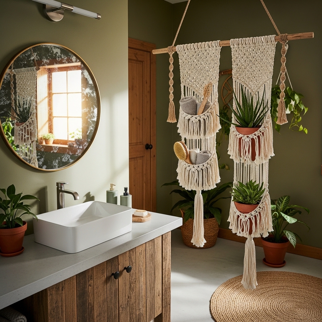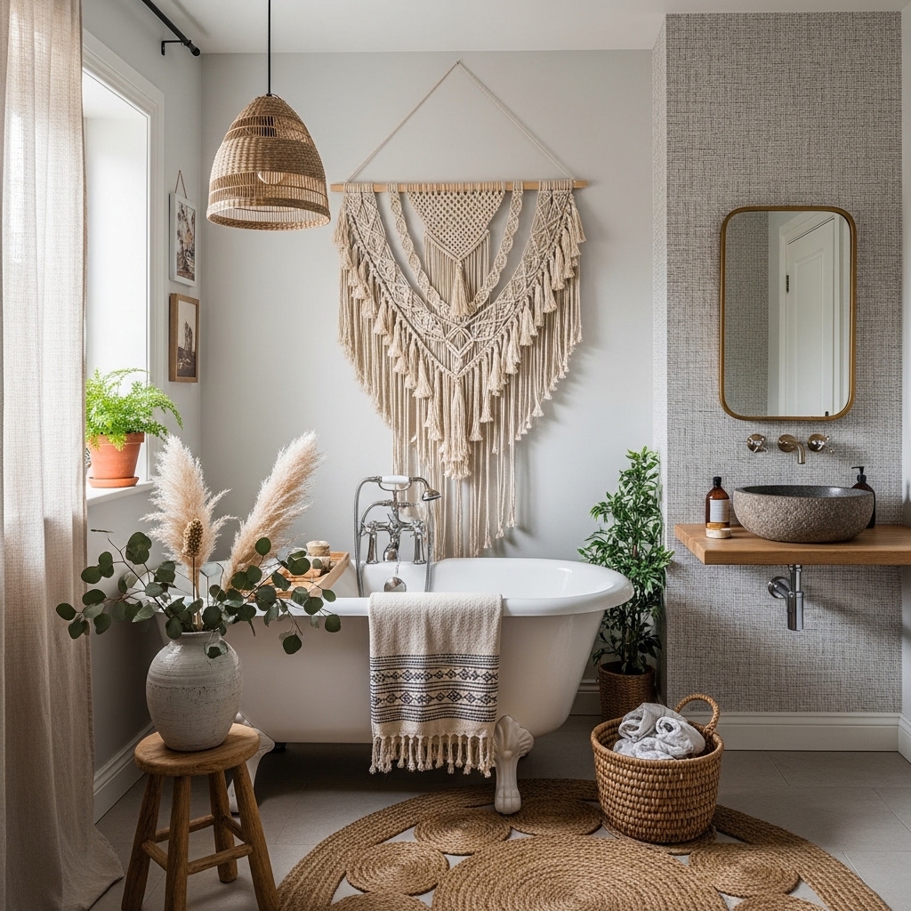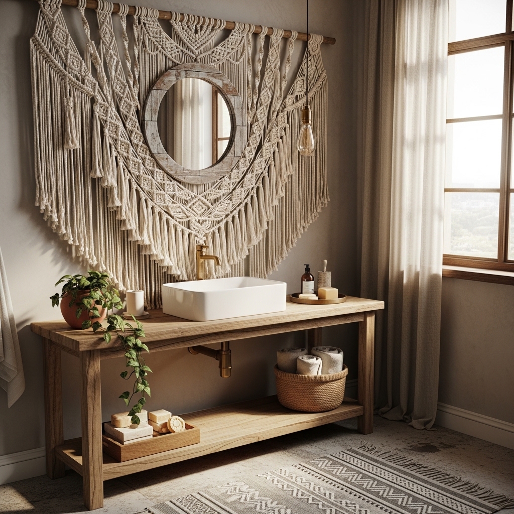 Hang a single macramรฉ piece above the toilet or near the vanity. Keep surrounding decor minimal.