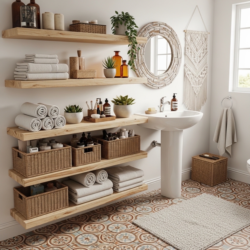 Ideal for: Bathrooms needing functional storage without heavy cabinets.