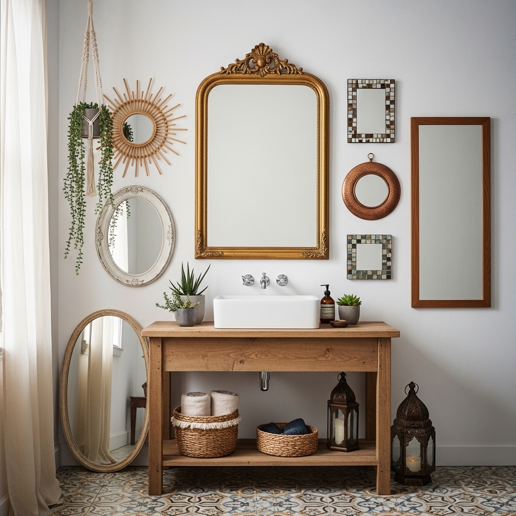 Swap standard mirrors for vintage-style frames to add personality. Keep size aligned with vanity width.