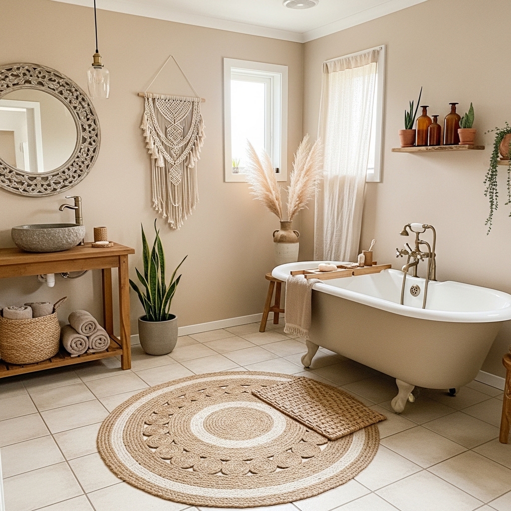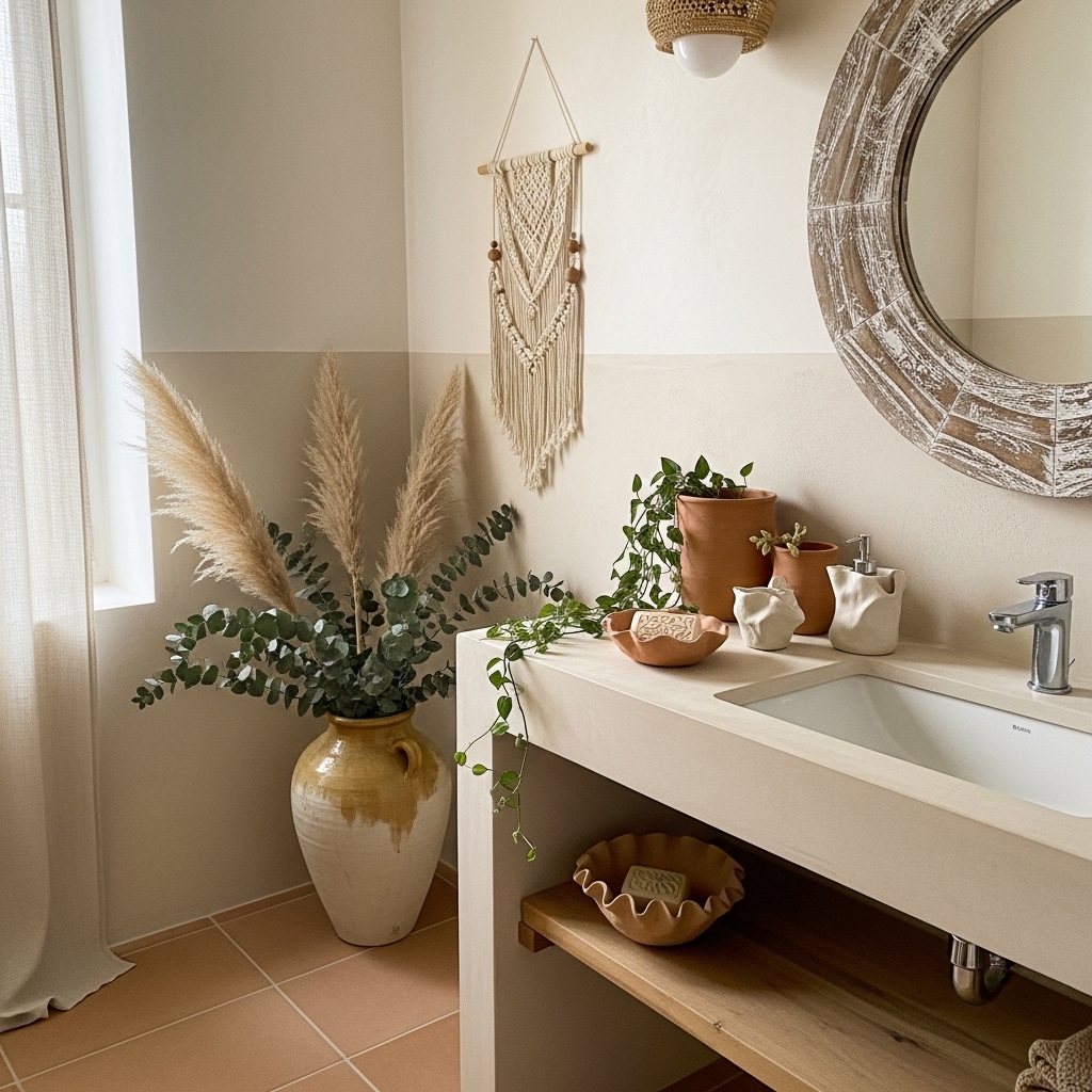 Boho bathroom decor is not about throwing a bunch of different textures together. It is about combining materials and soft colors with things that are actually useful in a way that looks like it was not that hard to do.