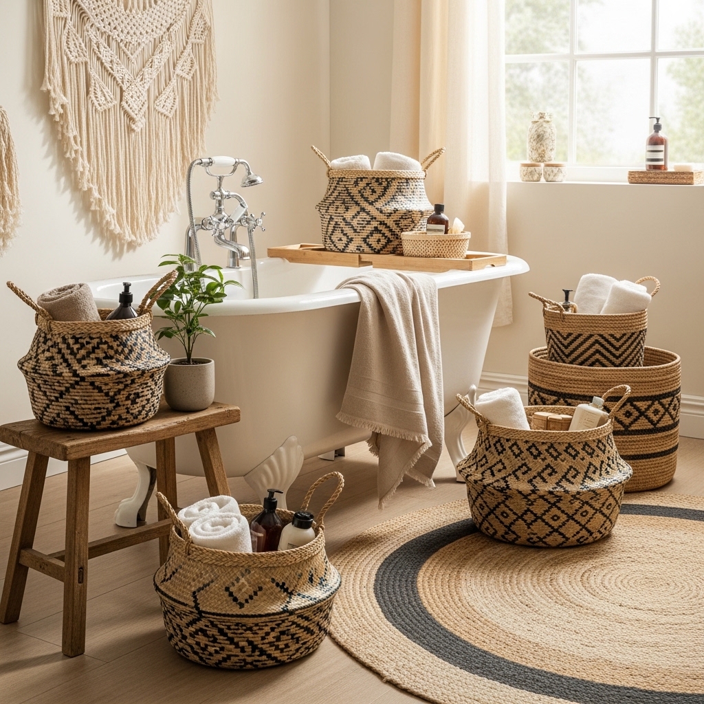 Use baskets to store towels or essentials while keeping them visually appealing. Place them under sinks or on shelves.