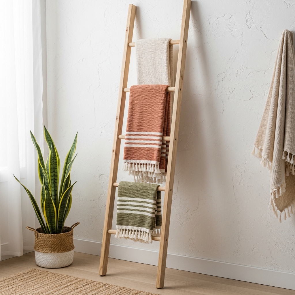 Lean a wooden ladder against the wall to hang towels. Keep spacing even.