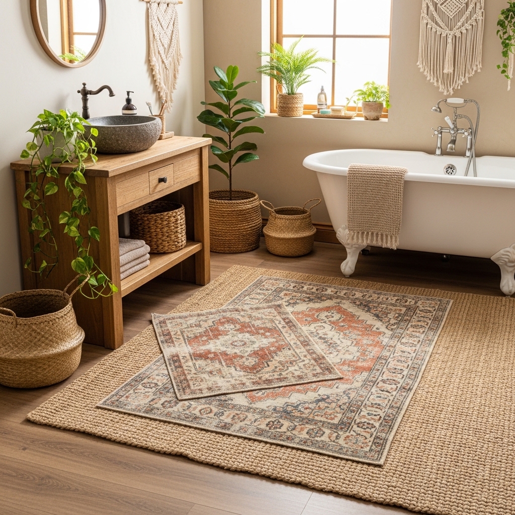 Use layered rugs or towels with subtle patterns to introduce texture without overwhelming the space. Keep the base neutral and layer gradually.