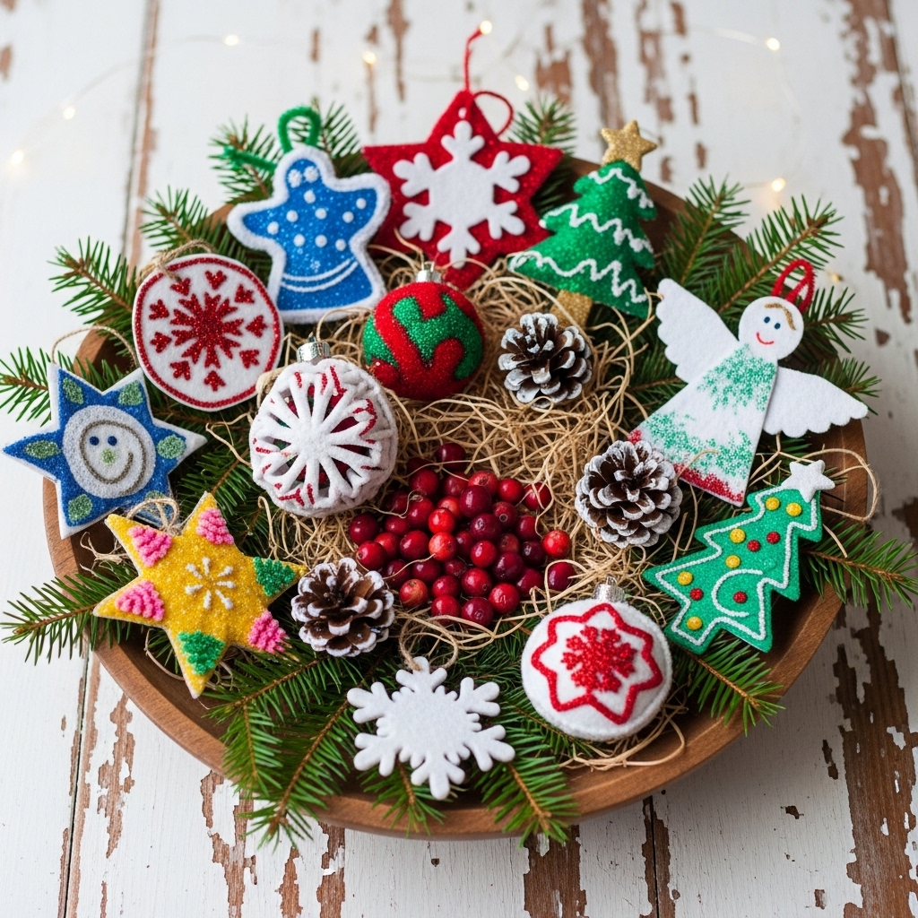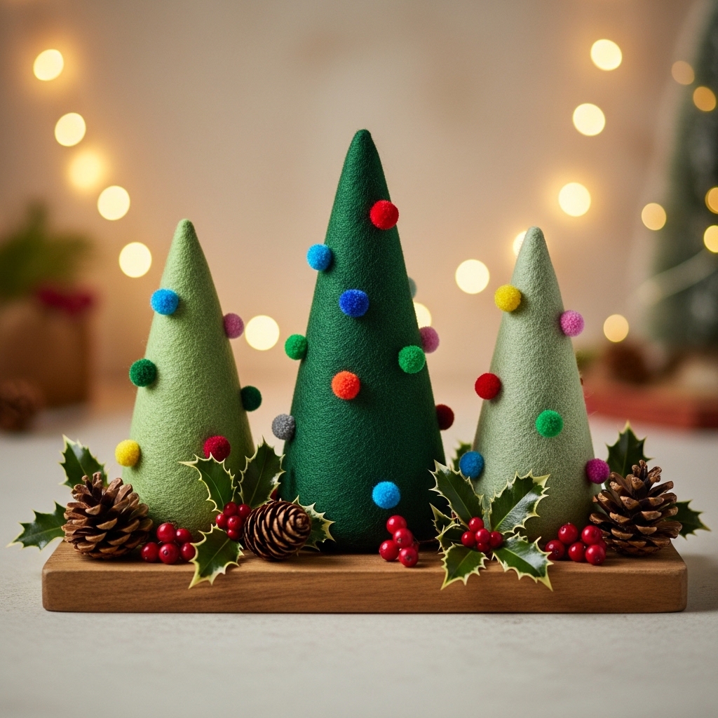 Create felt trees in festive colors and place them on a tray with tiny baubles or beads.