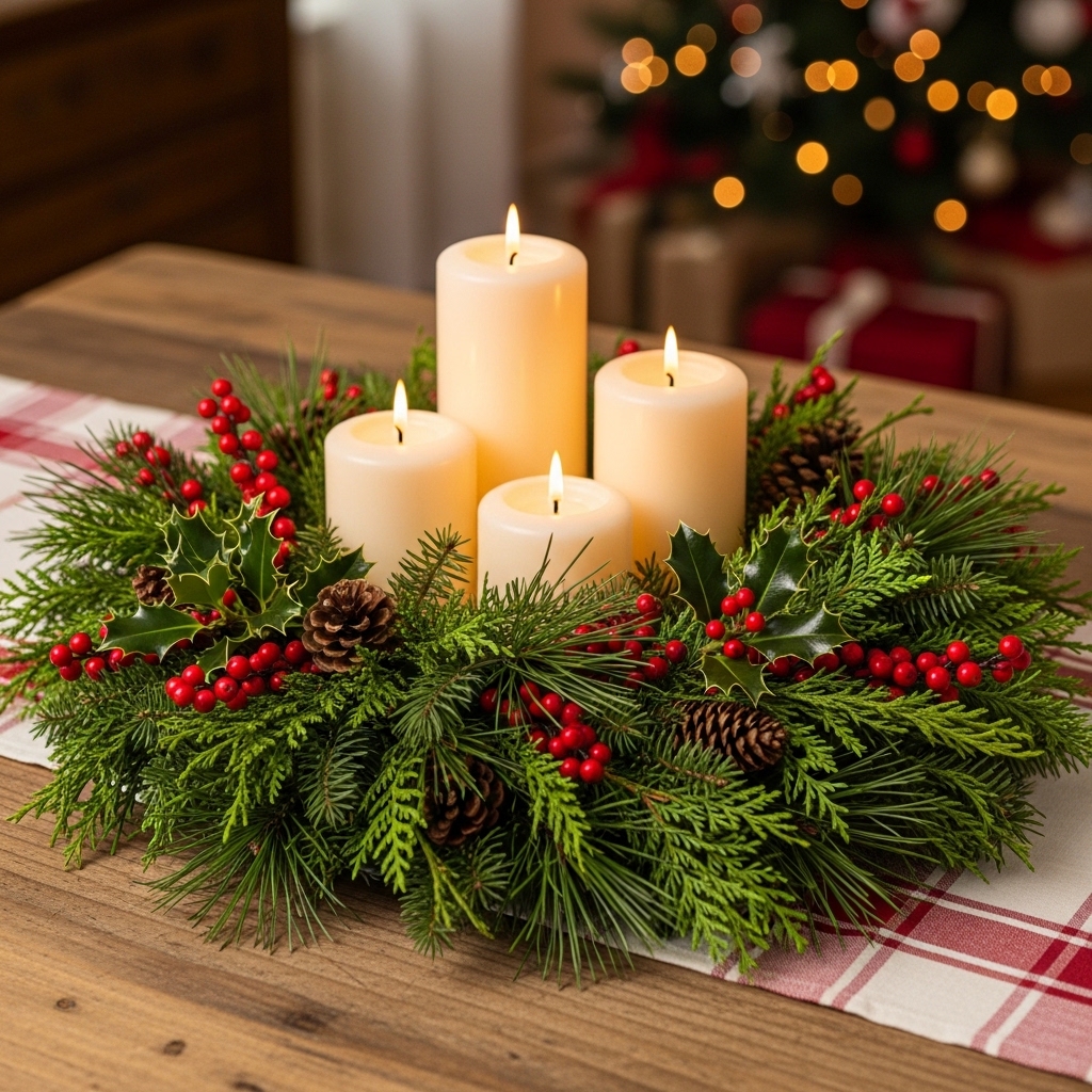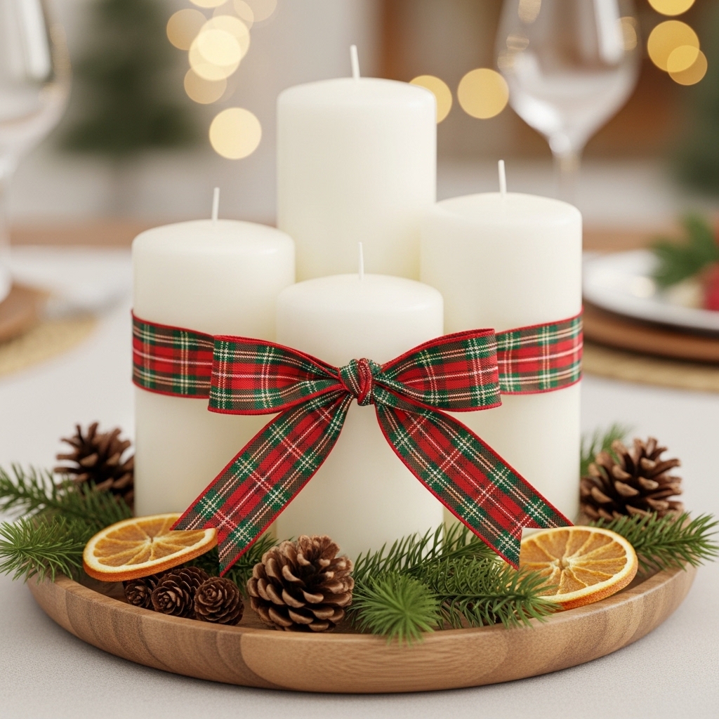 Wrap candles with festive ribbons and place them on a decorative plate or runner. Add sprigs of greens around the base.