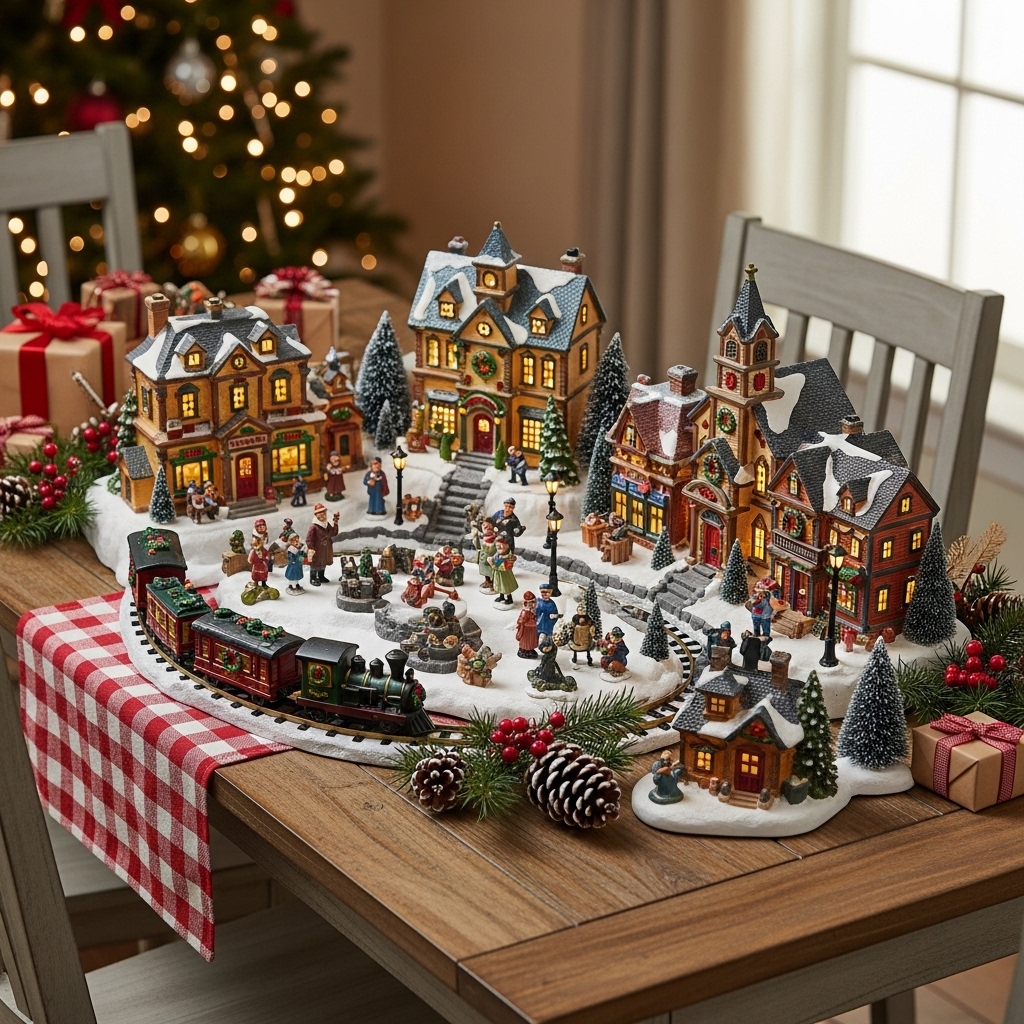 Use inexpensive mini houses or DIY small boxes painted like cottages. Add cotton “snow” and twinkle lights for a charming village centerpiece.