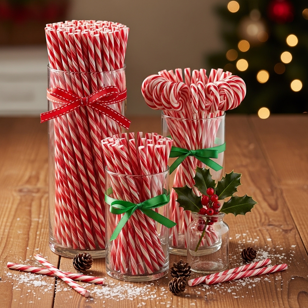 Bundle candy canes with ribbon and tuck them into a shallow bowl or decorative box. Add greenery or small baubles for flair.