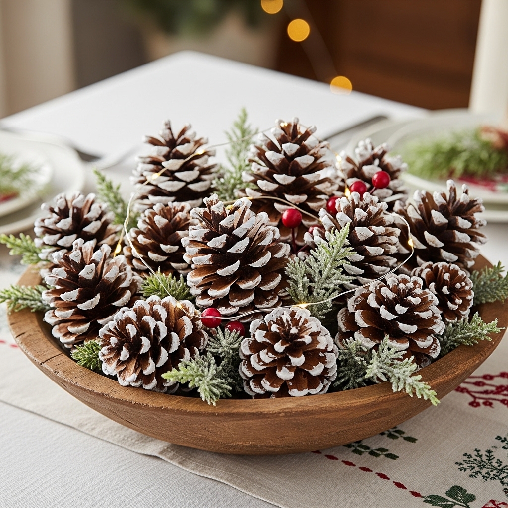 Place pinecones in a rustic wooden or decorative bowl. Sprinkle with fake snow or white paint tips for a snowy finish.