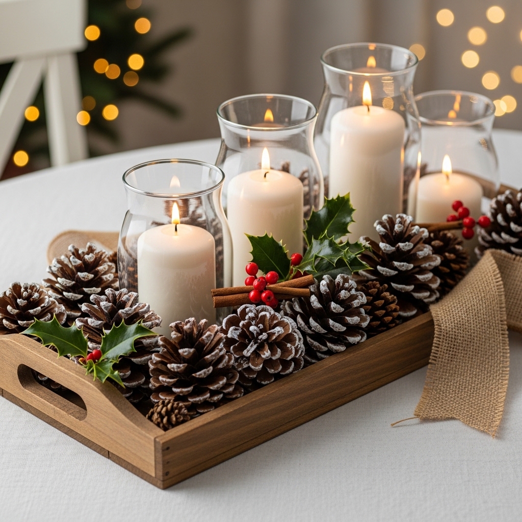 Collect pinecones or buy them cheaply from craft stores and arrange them around pillar candles on a wooden tray. Add a sprinkle of glitter or fake snow for sparkle.