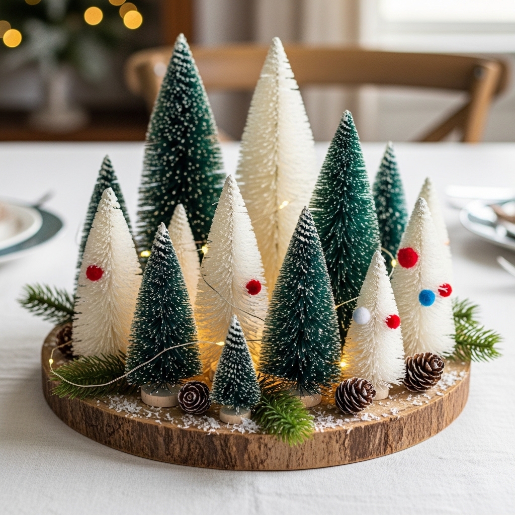 Small bottle brush trees are affordable and instantly festive. Cluster them in the center of your table with a light dusting of Epsom salt for a snowy effect.