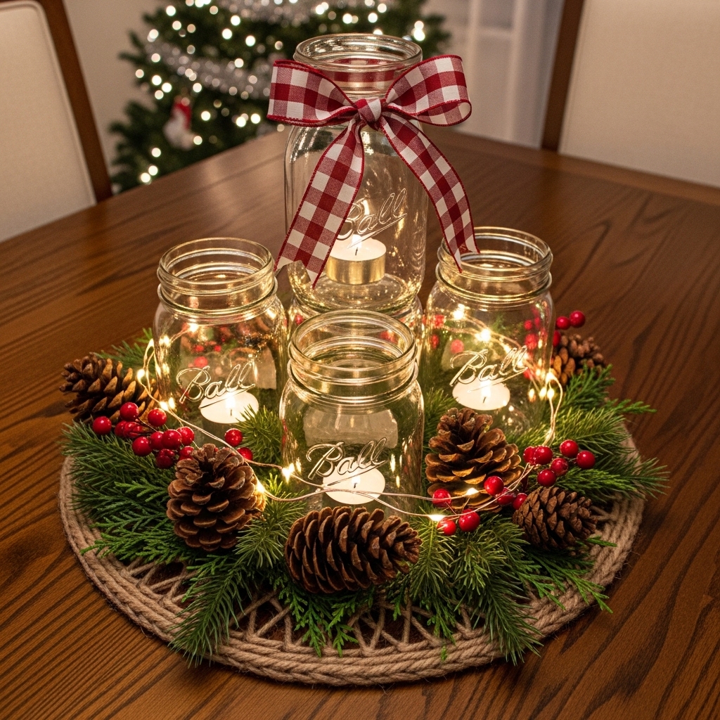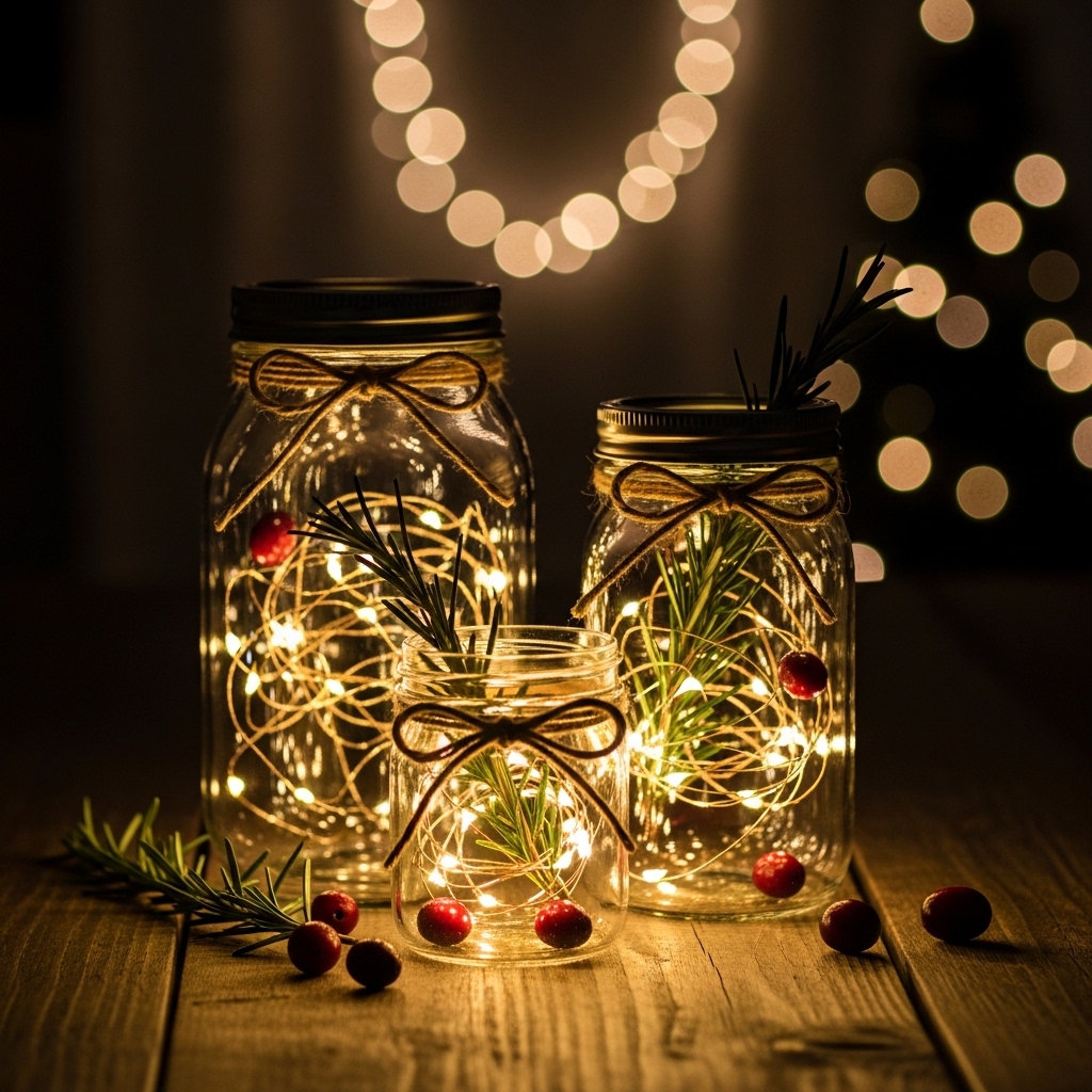 Fill mason jars with string lights and nestle them among greens or ribbon. The warm glow enhances cozy holiday vibes.