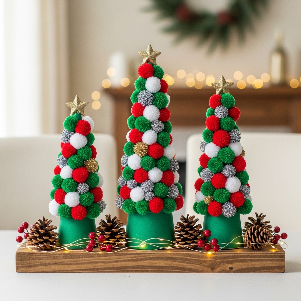 Create mini Christmas trees with foam cones and colorful yarn pom-poms. Place them on a mirrored tray to reflect light and color.