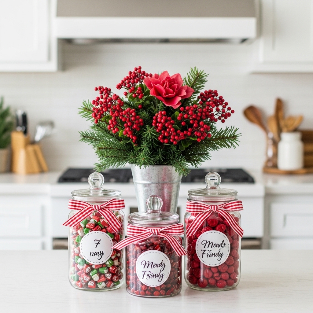 Fill clear jars with budget candies like peppermints, candy canes, and colored chocolates. Group three different sizes for an easy focal display.