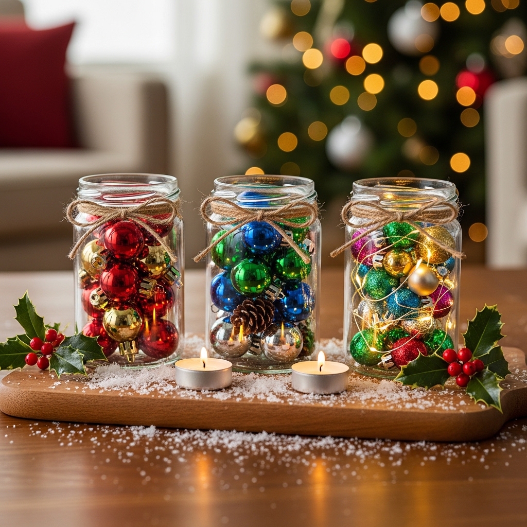 Fill small jars with leftover ornaments and metallic tinsel. Group them with candles or greenery.