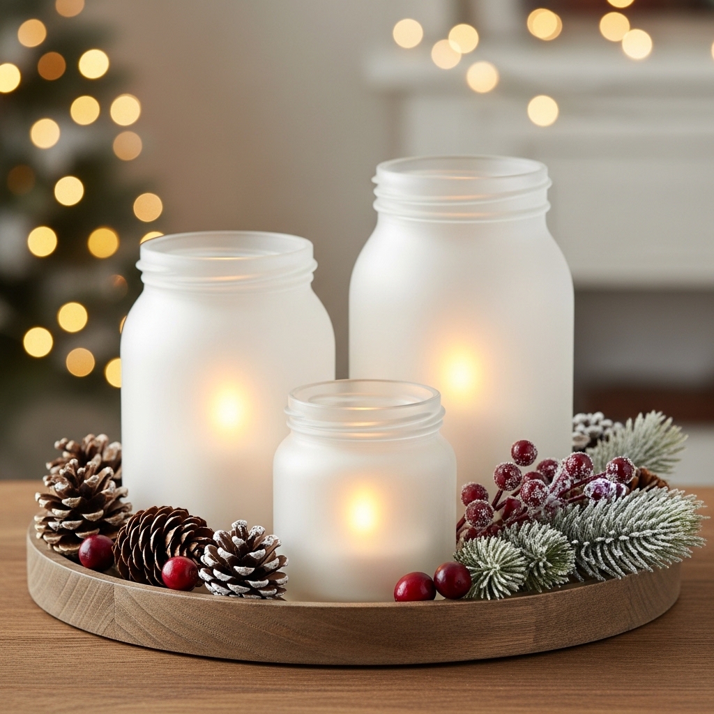 Apply a thin coat of Epsom salt or DIY frosted paint to recycled jars. Place tealights inside to create a snowy glow.