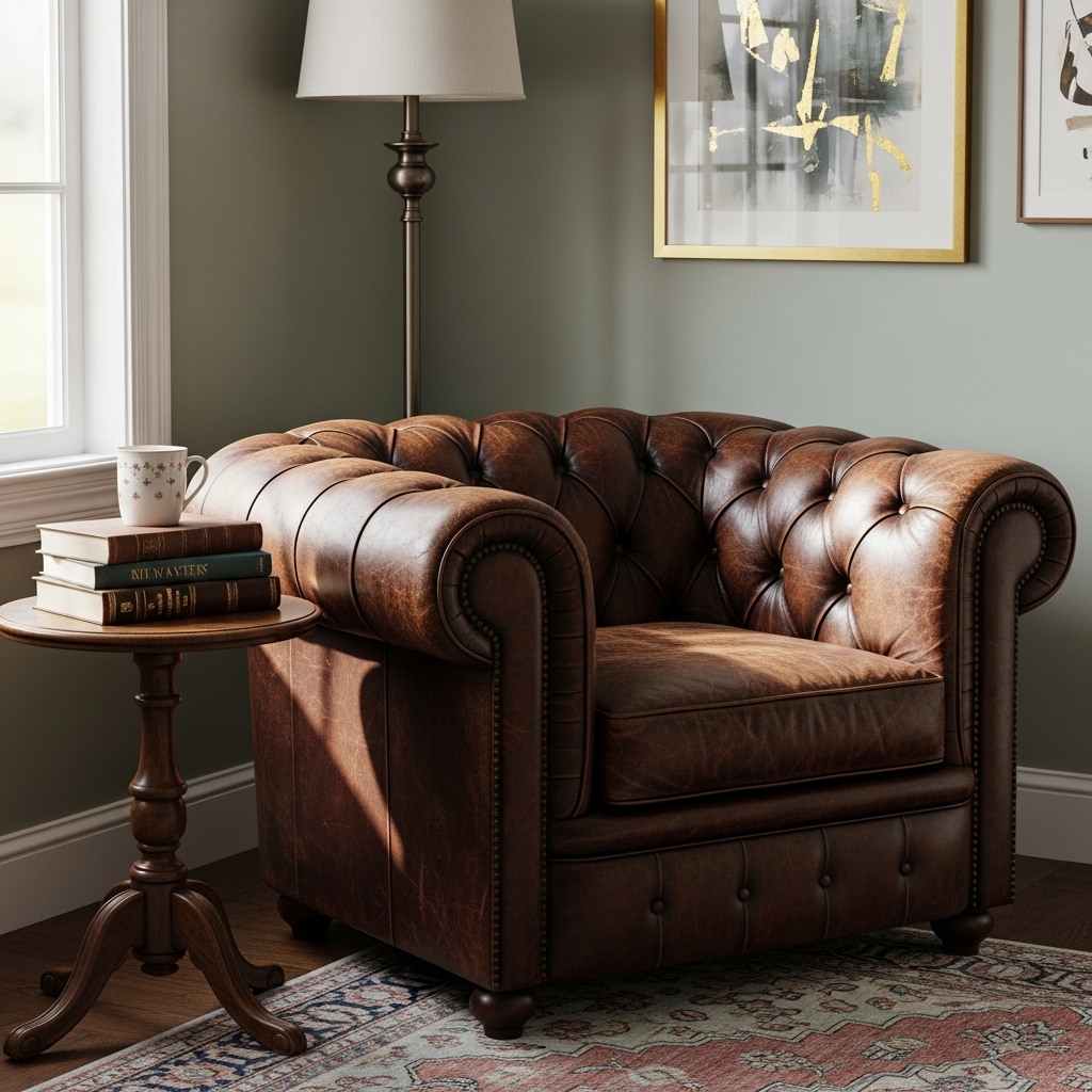 Look for a leather chair at an estate sale. The leather may be worn. The patina is the beauty.