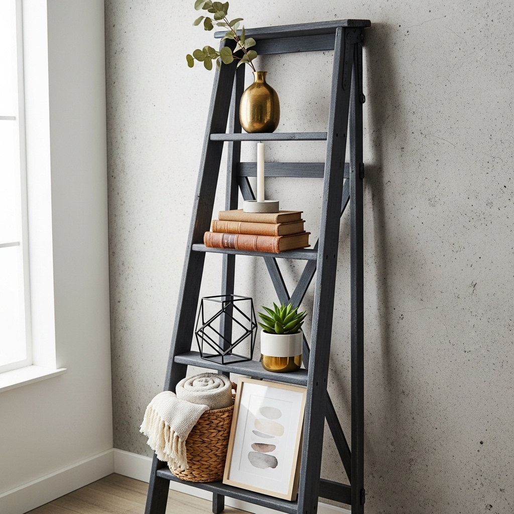 Find an old wooden ladder. Lean it against the wall. Place boards across the rungs. Use the ladder as a bookshelf.