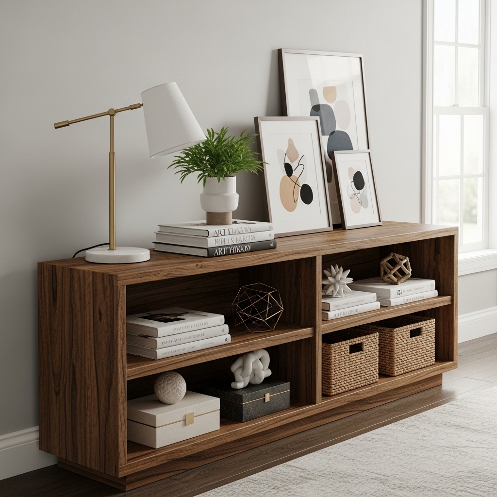 A bookshelf is vertical. Turn it sideways and it becomes a console table.