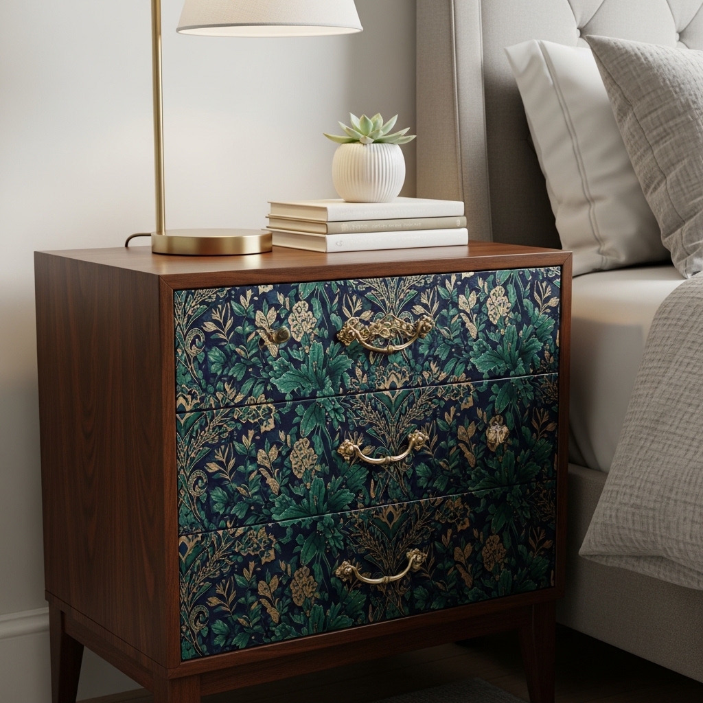 A $10 nightstand is plain. Add wallpaper to the drawer fronts.