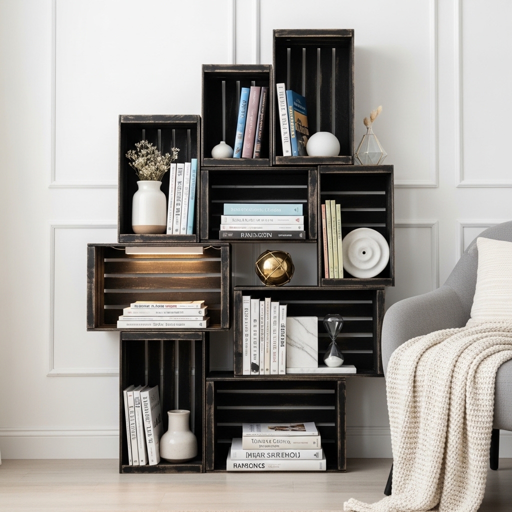Arrange crates in a grid. Secure them together with screws. Use the crates as shelves. The industrial look is intentional.