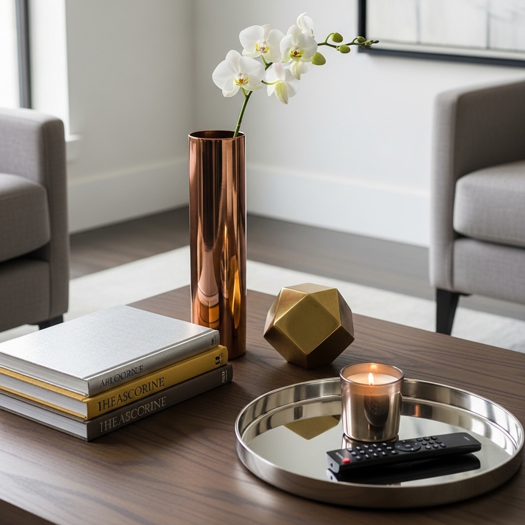 Add one or two metallic elements like a gold tray or brass candle holder. Pair with neutral items to soften the shine.
