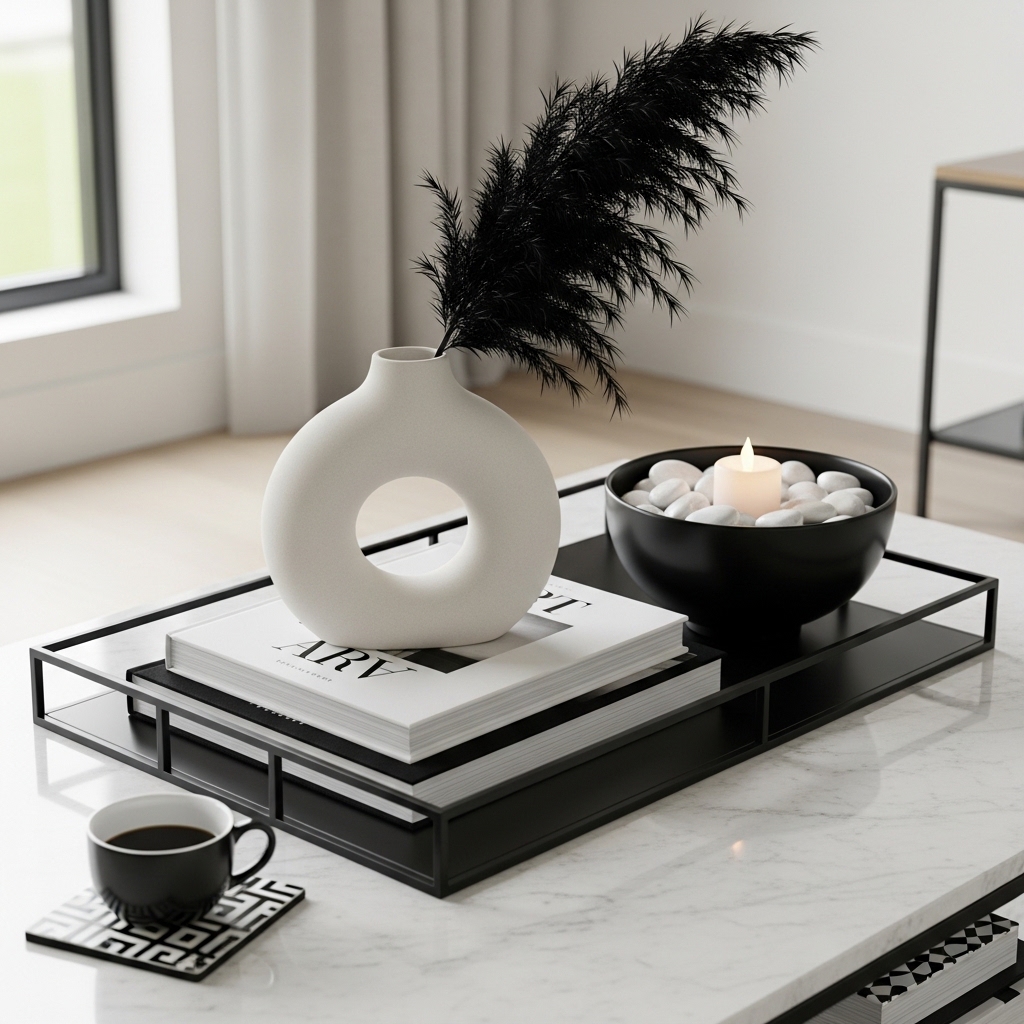 Use black and white decor pieces like vases, books, and trays arranged in a clean layout. Keep shapes simple.