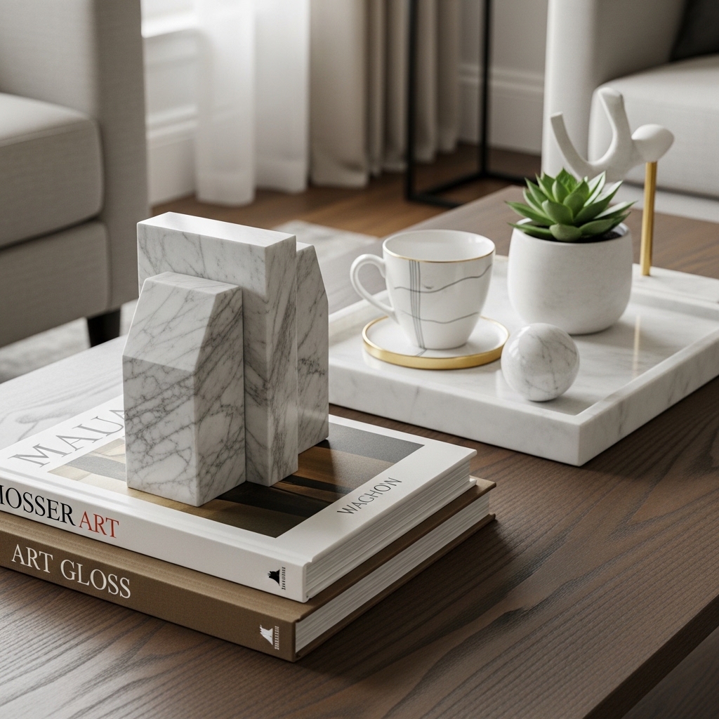 Place a marble tray, sculpture, or decorative piece at the center or layered with books. Pair it with minimal elements to maintain elegance.