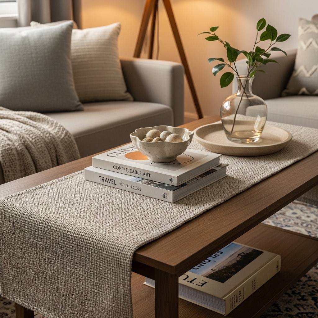 Lay a narrow fabric runner across the coffee table and place decor items on top of it. Choose linen, cotton, or woven textures in neutral tones. Keep the runner proportionate to the table size and avoid letting it hang too long on either side.