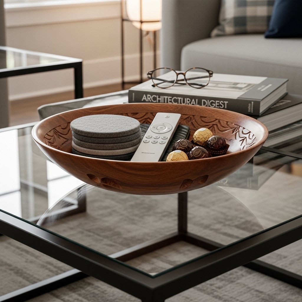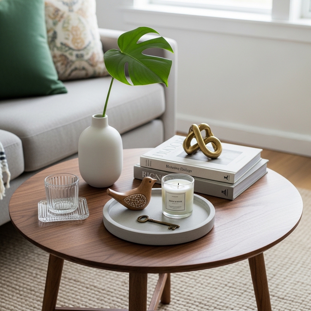 Place a shallow decorative bowl in the center to hold keys, remotes, or small items. Keep the design simple and uncluttered.