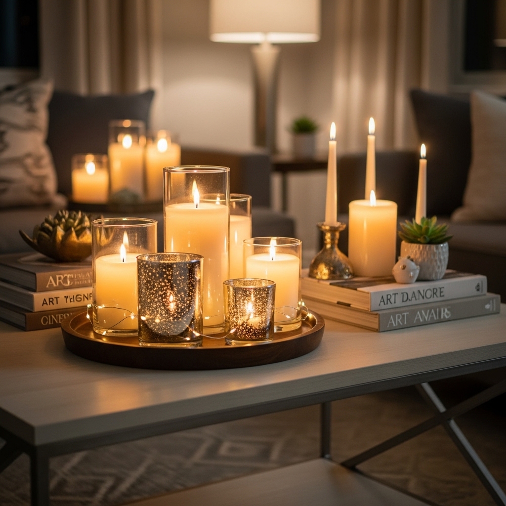 This works because height variation creates depth while soft candlelight adds warmth and atmosphere. Uniform candle sizes often look flat and less engaging.