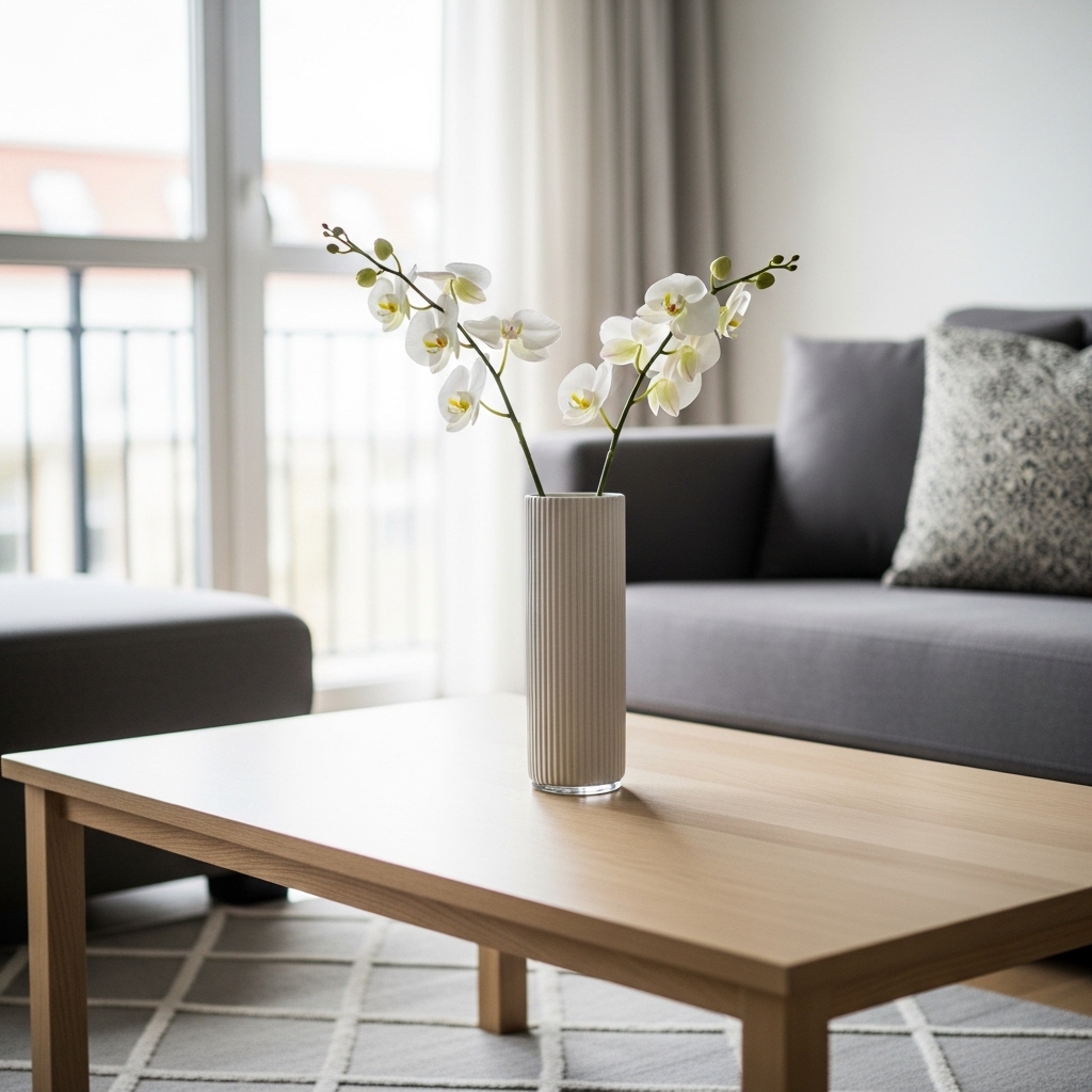Place a single vase with fresh or dried stems at the center or slightly off-center. Choose simple shapes like cylindrical or oval designs in neutral tones.