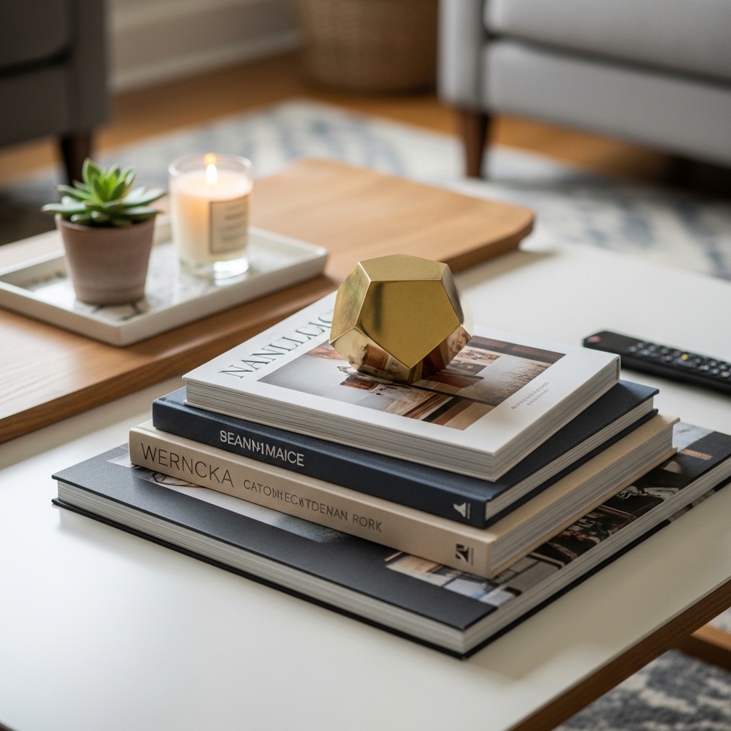Stack two or three large coffee table books horizontally and place a small decorative object like a candle or sculpture on top. Position the stack slightly off-center instead of placing it directly in the middle to create a relaxed, modern layout. Choose books with neutral or cohesive covers that match your room’s color palette.