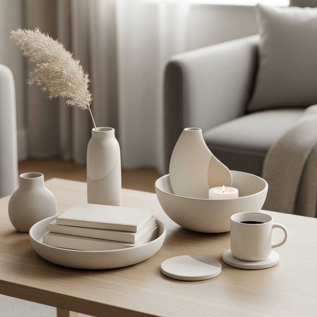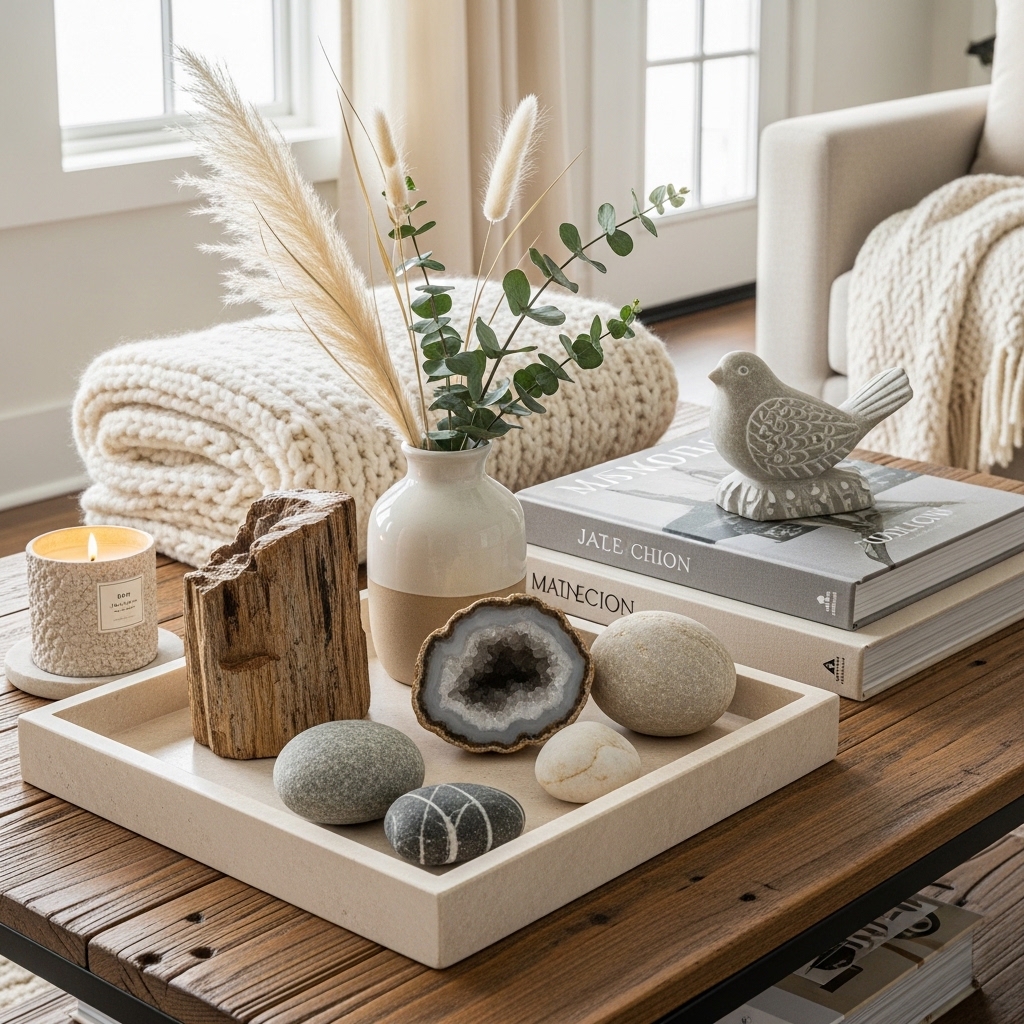 Use decor pieces in shades of beige, white, gray, or soft brown. Layer items like books, vases, and candles while keeping color consistency.