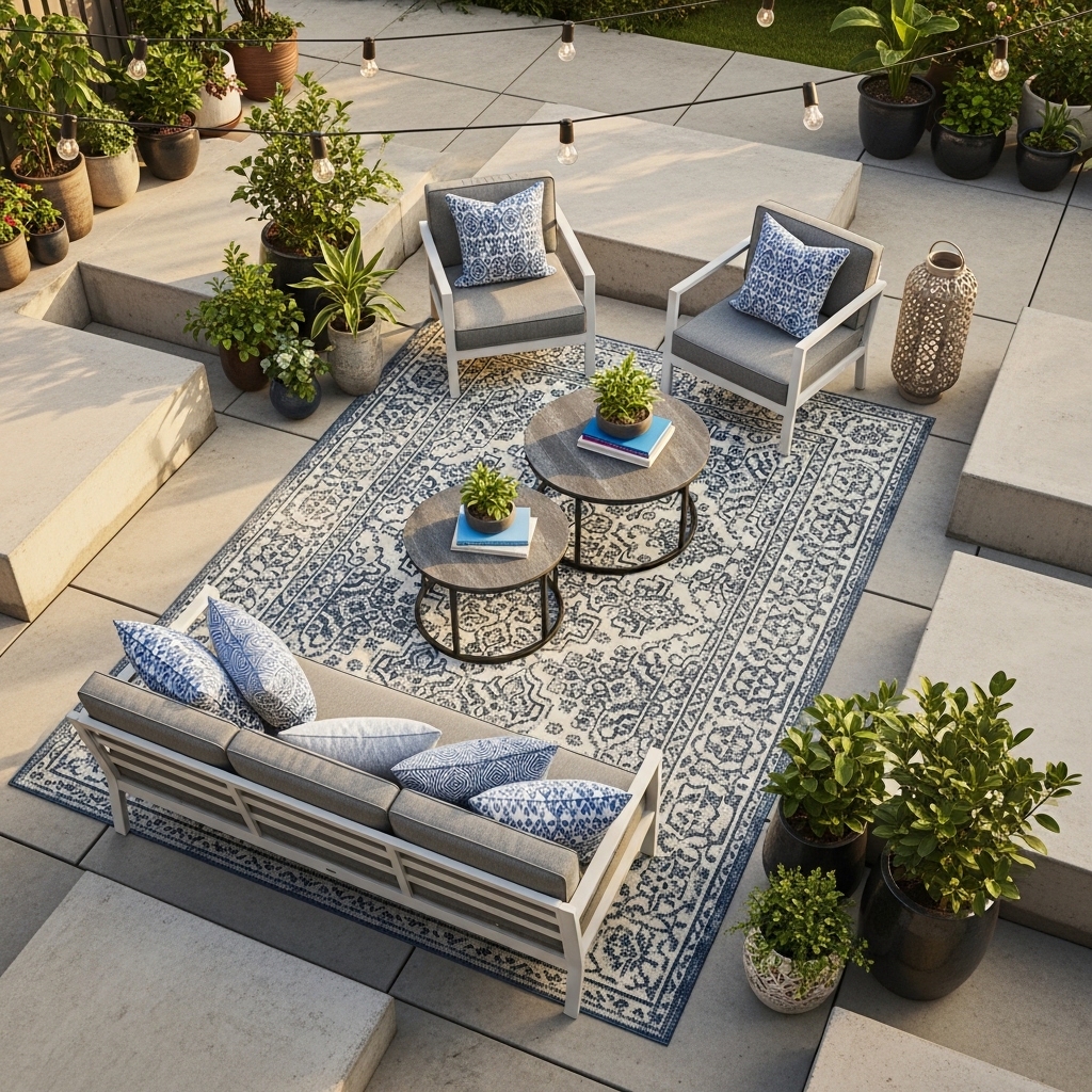 Place weather-resistant rugs under seating or dining areas to add comfort and visual warmth.