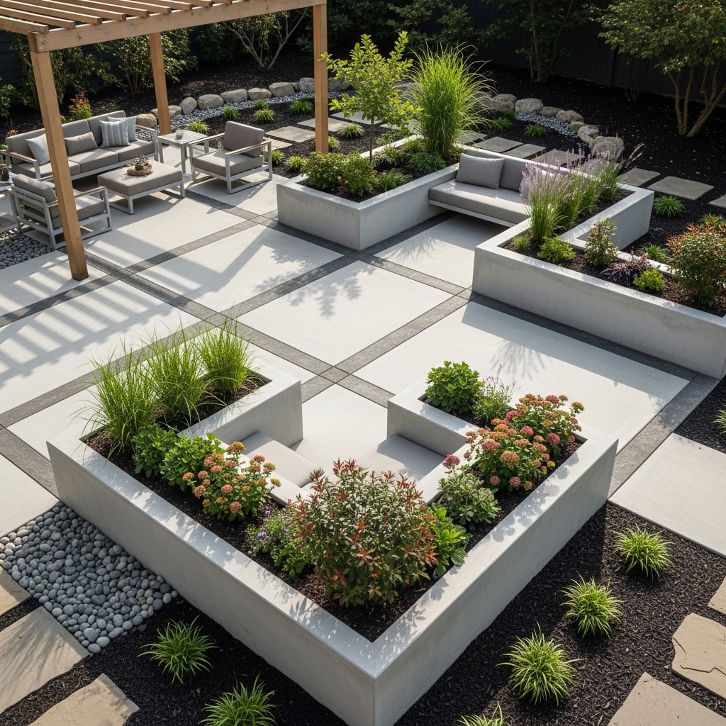Install concrete planters that match the patio surface in tone and texture. Place them strategically around edges.