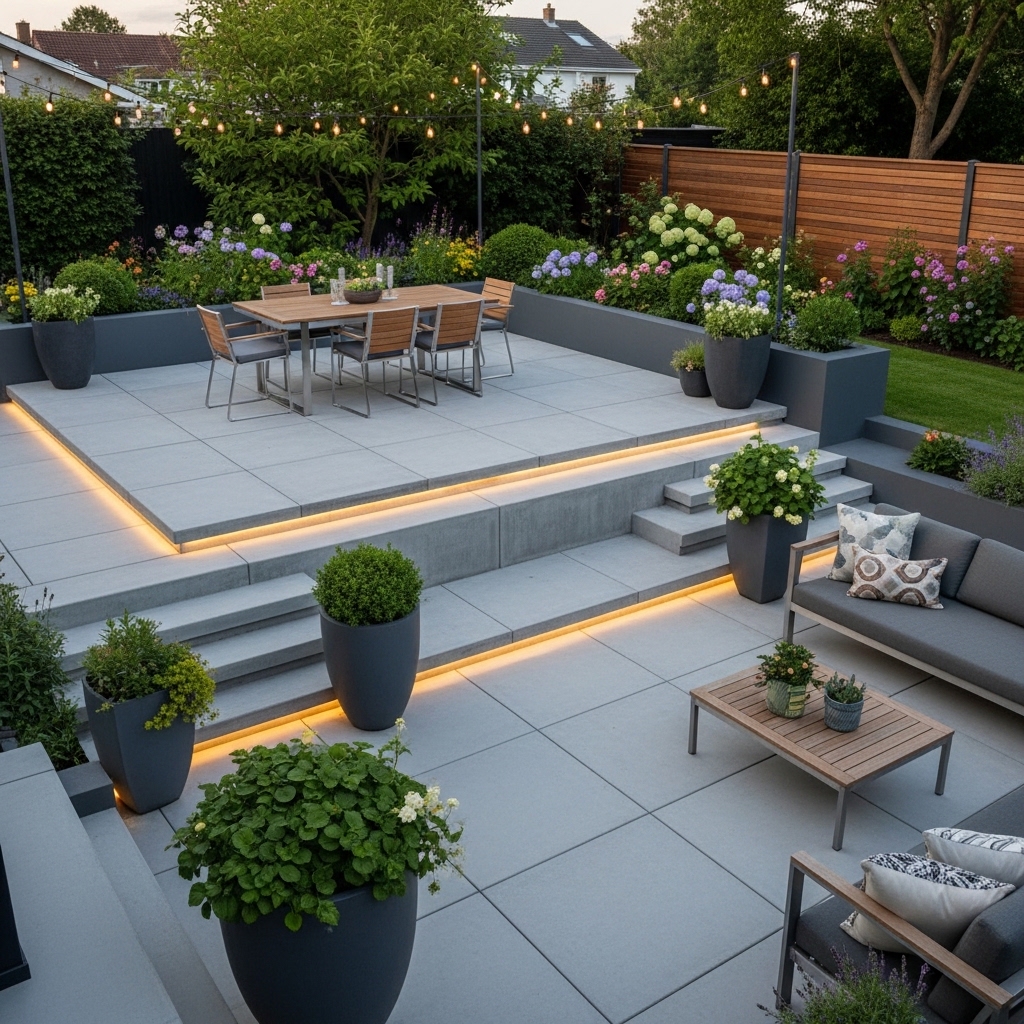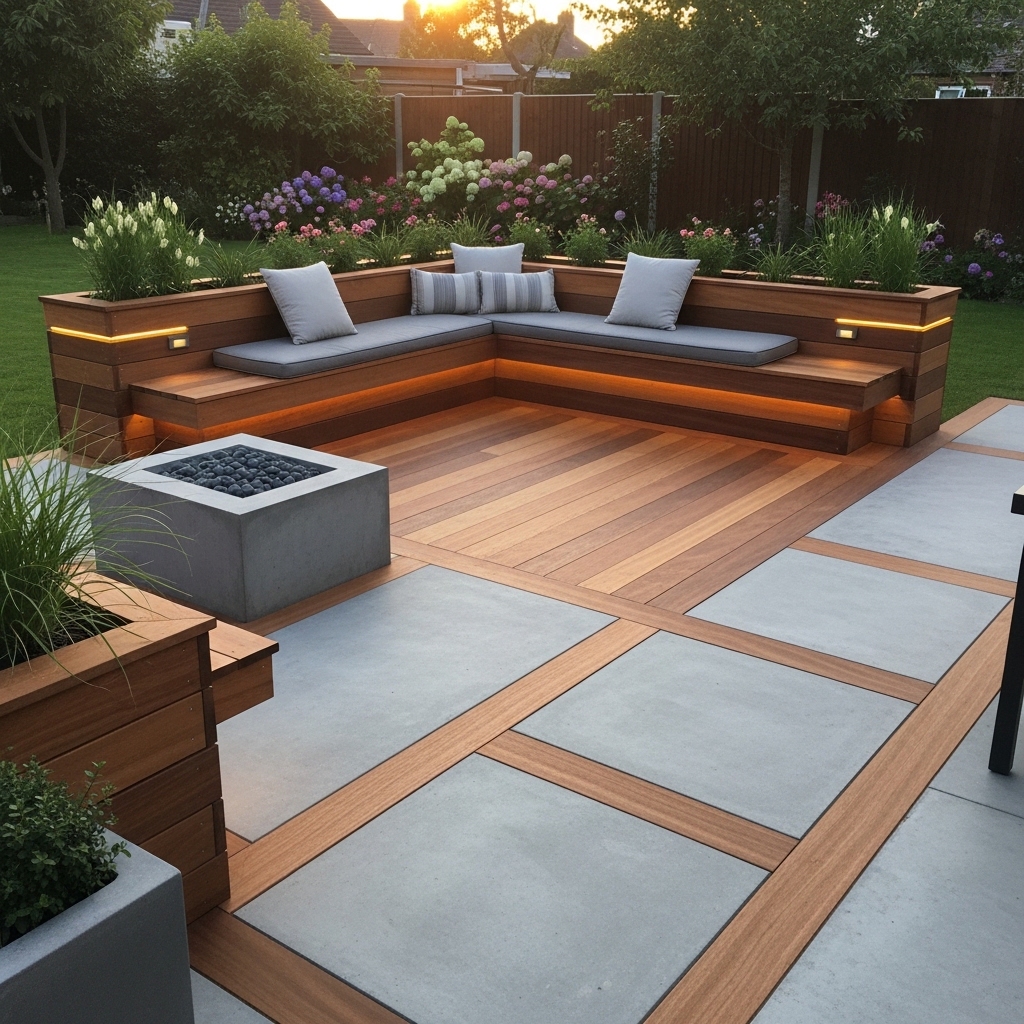 Incorporate wooden decking strips, furniture, or planters alongside concrete surfaces. Balance both materials.