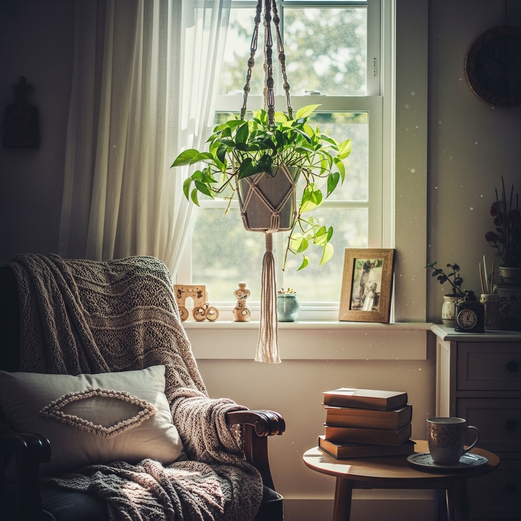Hang a macrame plant holder in a sunny window. Add a trailing plant. The vines will grow toward the light.