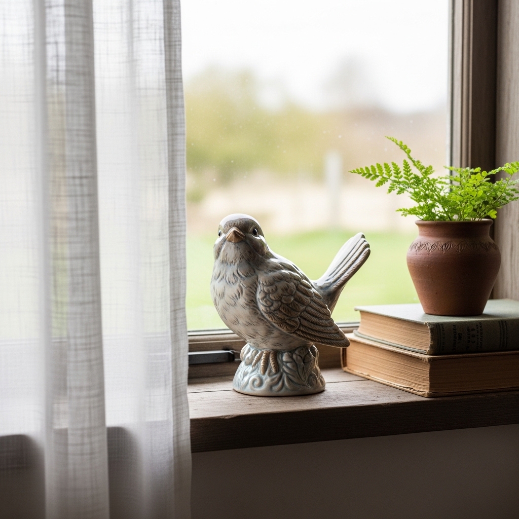 Set a small ceramic bird on the windowsill. The bird should be matte. The colors should be muted.