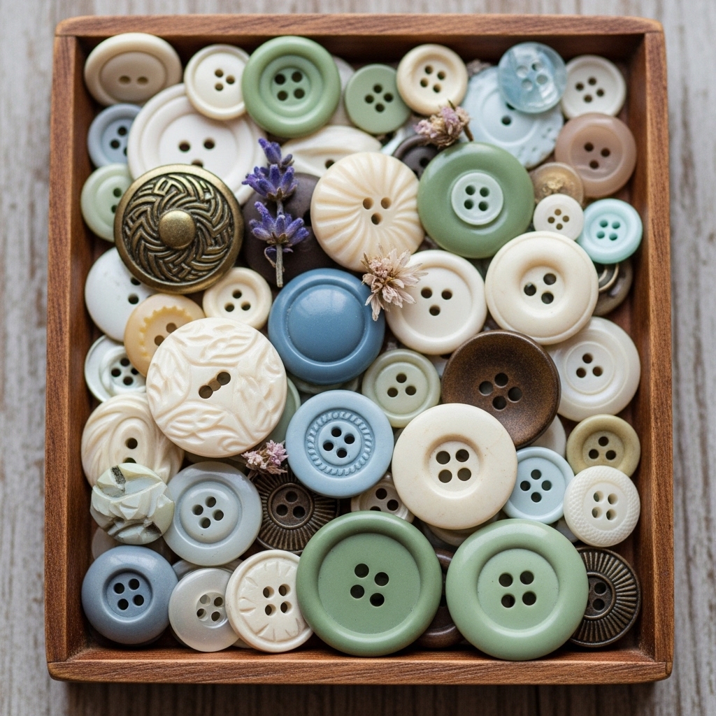 Arrange vintage buttons in a shallow bowl. The buttons should be mother-of-pearl, glass, or wood.