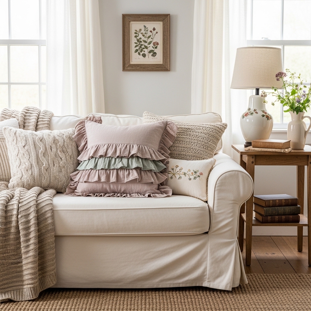 Place a ruffled pillow on the sofa. The fabric should be linen or cotton. The color should be cream or blush.
