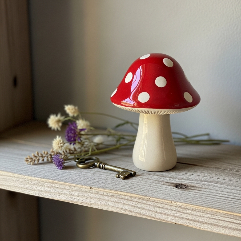 Find a ceramic mushroom at a craft fair. Place it on a bookshelf. The mushroom should be matte. The colors should be muted.