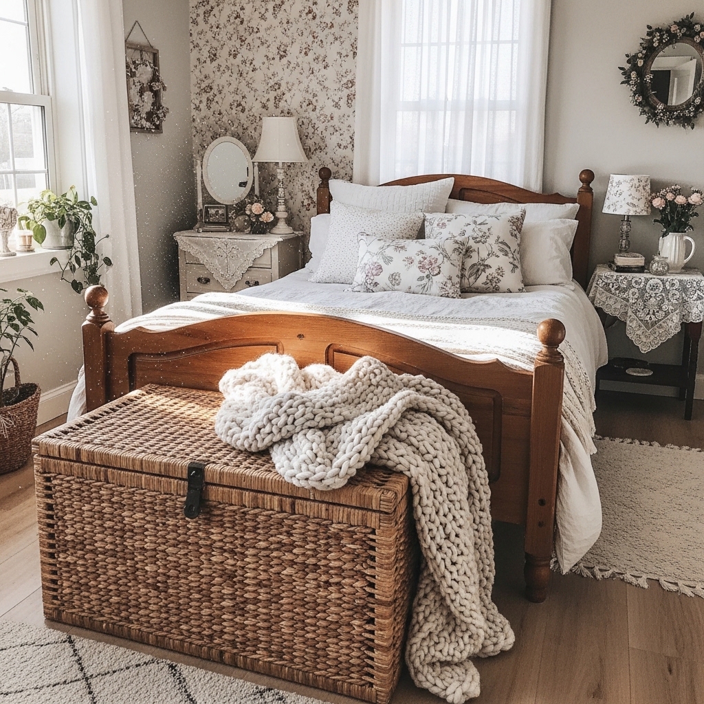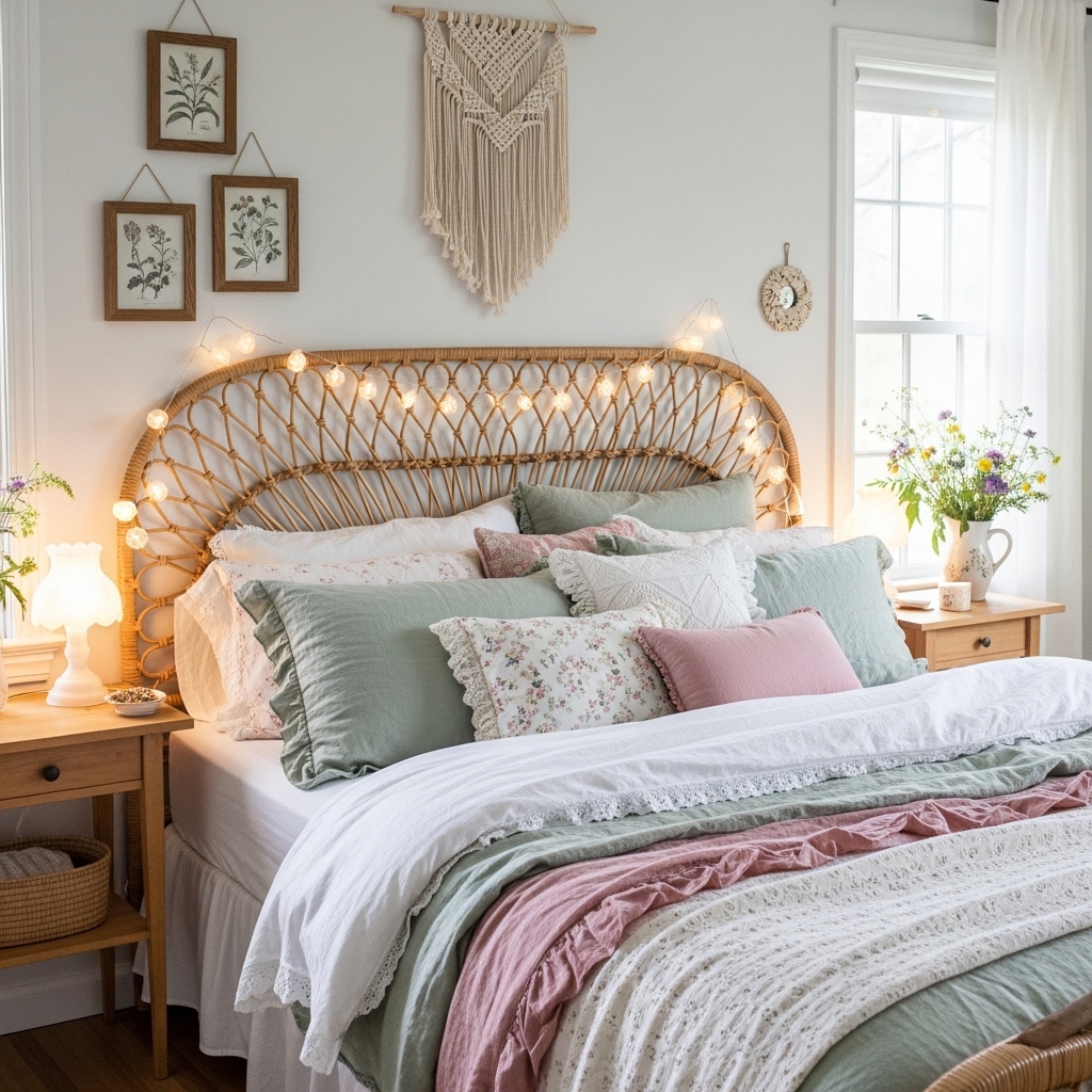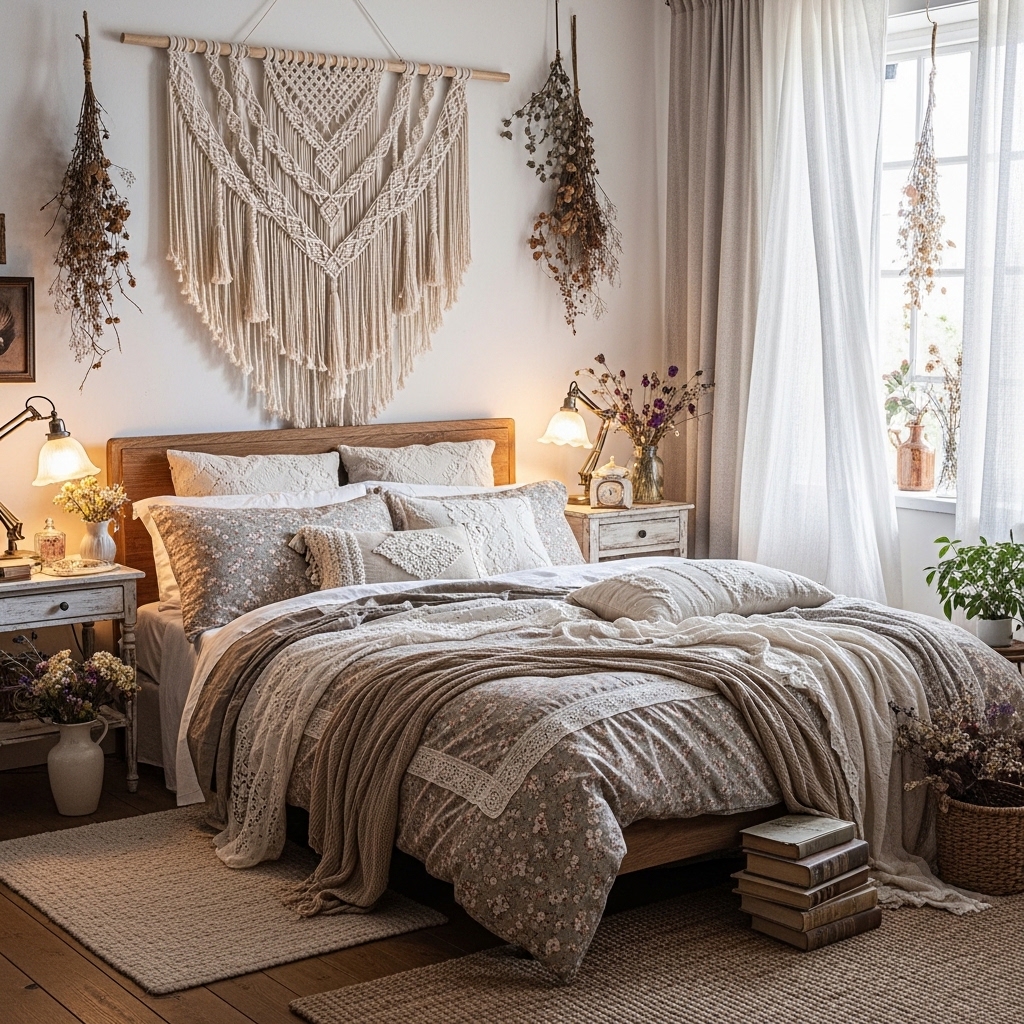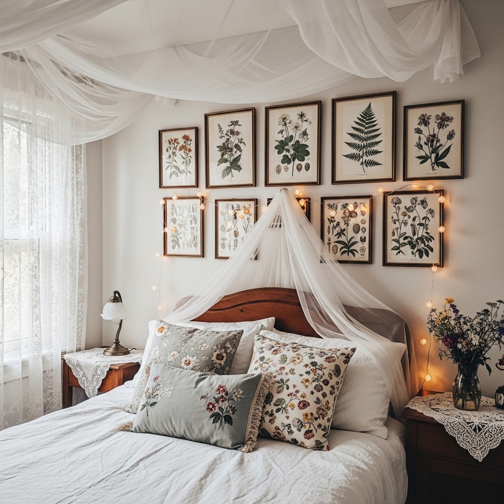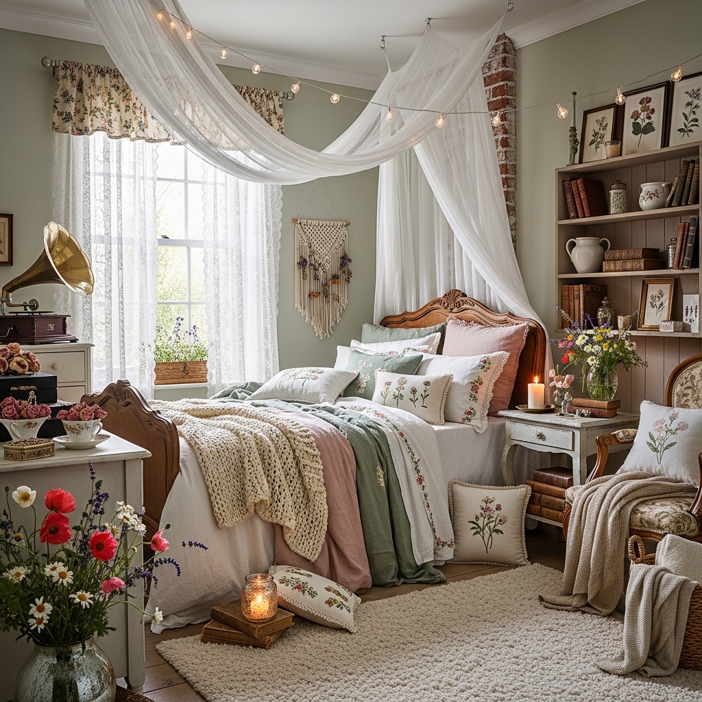 Cottagecore bedrooms are soft, romantic, and deeply personal. Sheer canopies over the bed. Layered quilts and coverlets. Dried lavender bundles hanging from the headboard. Vintage nightstands with crocheted doilies. Wicker or cane headboards. Botanical prints above the bed. Floral rugs on the floor. Macrame wall hangings. Vintage pillows in mismatched fabrics. Potted ferns on dressers. String lights behind the headboard. Woven blanket chests at the foot of the bed. Ceramic birds on nightstands. Floral garlands across windows. Hand-knitted throws. Stacked vintage books. Copper wind chimes in windows. Lace-edged pillowcases. Potted English ivy on shelves. Leather journals on nightstands.