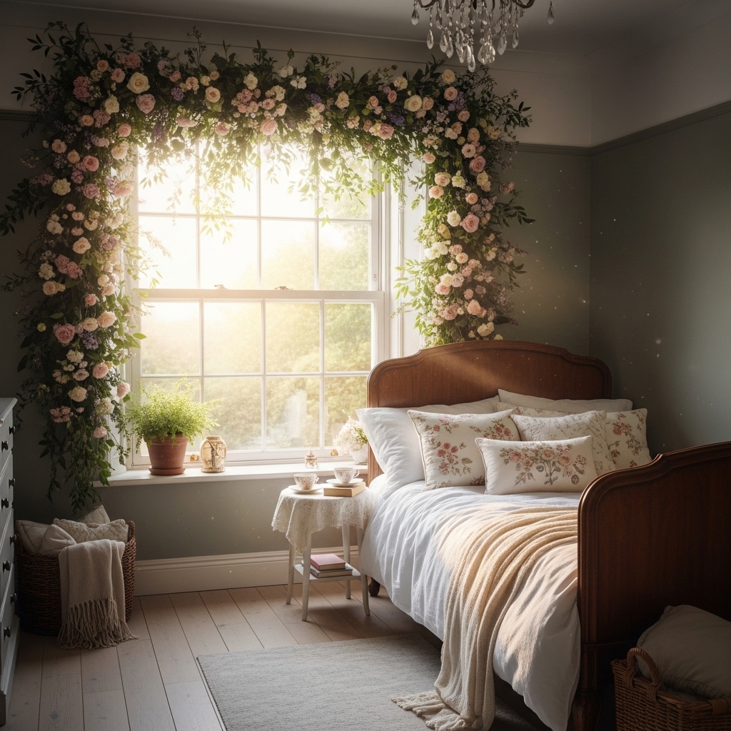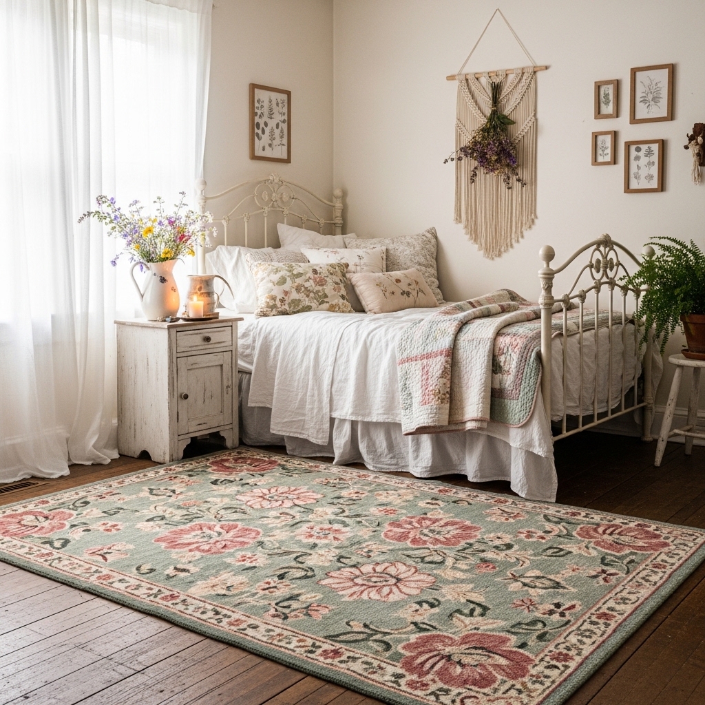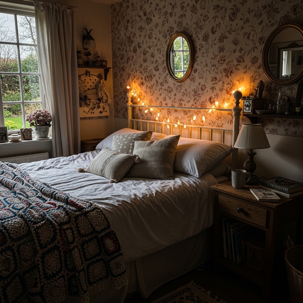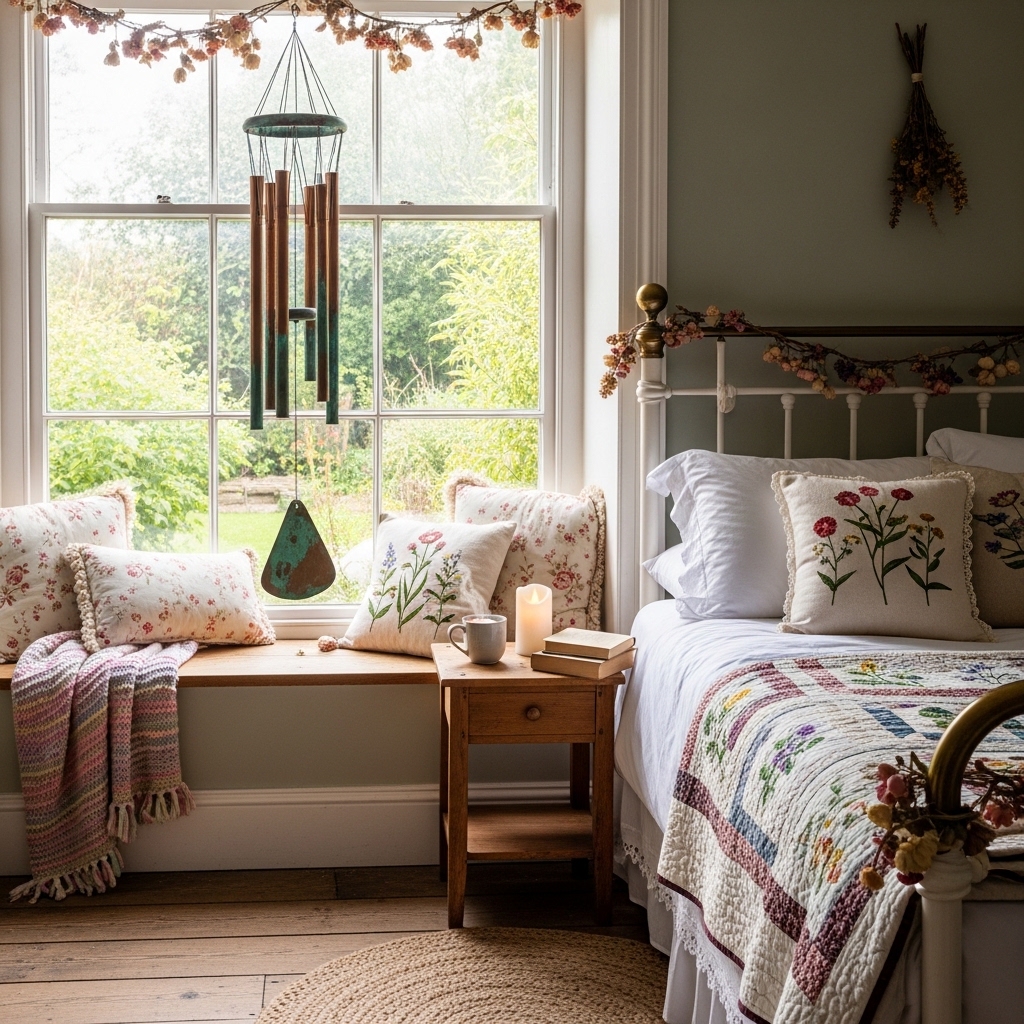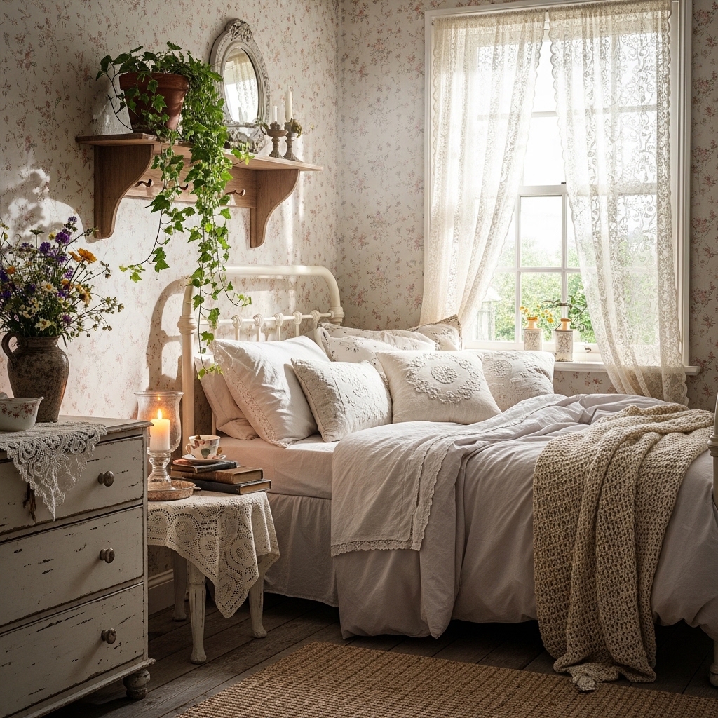 Cottagecore bedrooms are soft, romantic, and deeply personal. Sheer canopies over the bed. Layered quilts and coverlets. Dried lavender bundles hanging from the headboard. Vintage nightstands with crocheted doilies. Wicker or cane headboards. Botanical prints above the bed. Floral rugs on the floor. Macrame wall hangings. Vintage pillows in mismatched fabrics. Potted ferns on dressers. String lights behind the headboard. Woven blanket chests at the foot of the bed. Ceramic birds on nightstands. Floral garlands across windows. Hand-knitted throws. Stacked vintage books. Copper wind chimes in windows. Lace-edged pillowcases. Potted English ivy on shelves. Leather journals on nightstands.