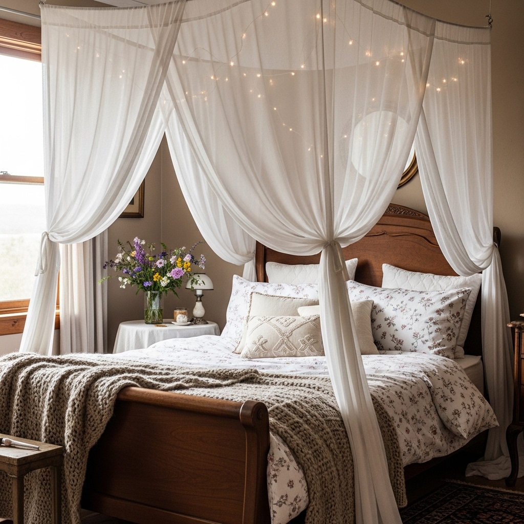 Hang sheer fabric from a ceiling hook. Let it drape around the headboard. The fabric should be white or cream. The fabric should be lightweight.