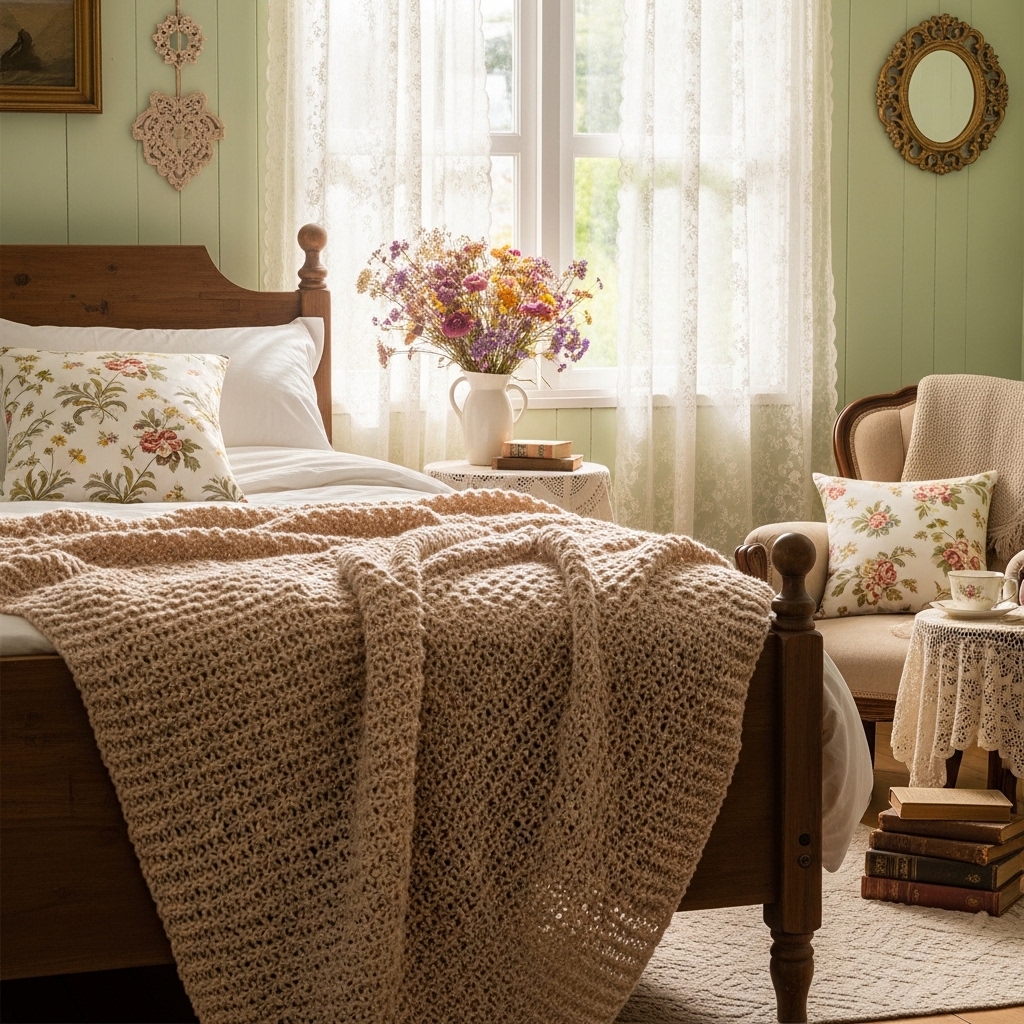 Drape a hand-knitted throw over the foot of the bed. The yarn should be thick. The color should be cream or rose.
